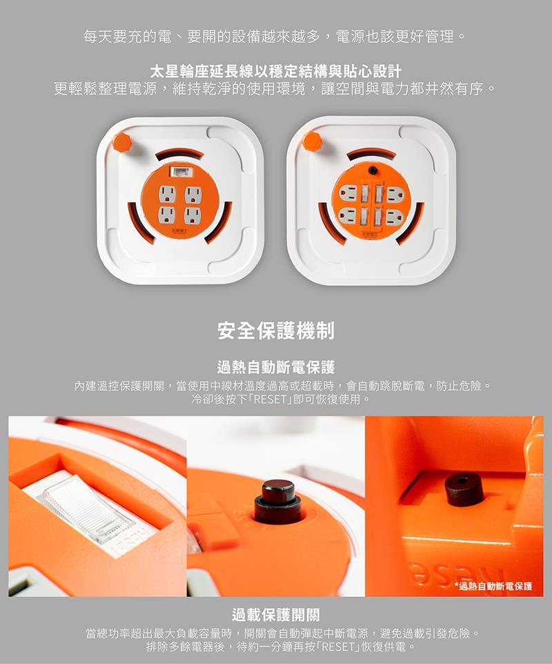 (使用中線材超出承受溫度,過載保護開關即會彈起,此時請將不需要的電器插頭拔除並拔離電源,等降溫後再將「RESET」按鈕輕壓一下即可正常使用)