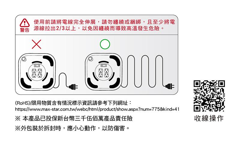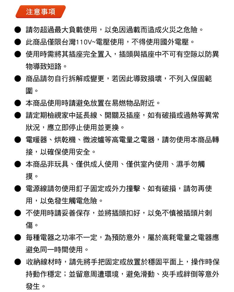 1.請勿超過最大負載使用,以免因過載而造成火災之危險。