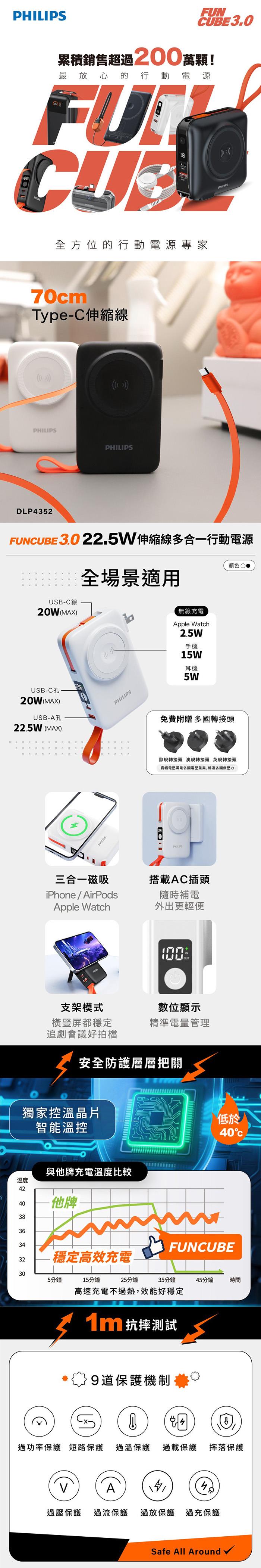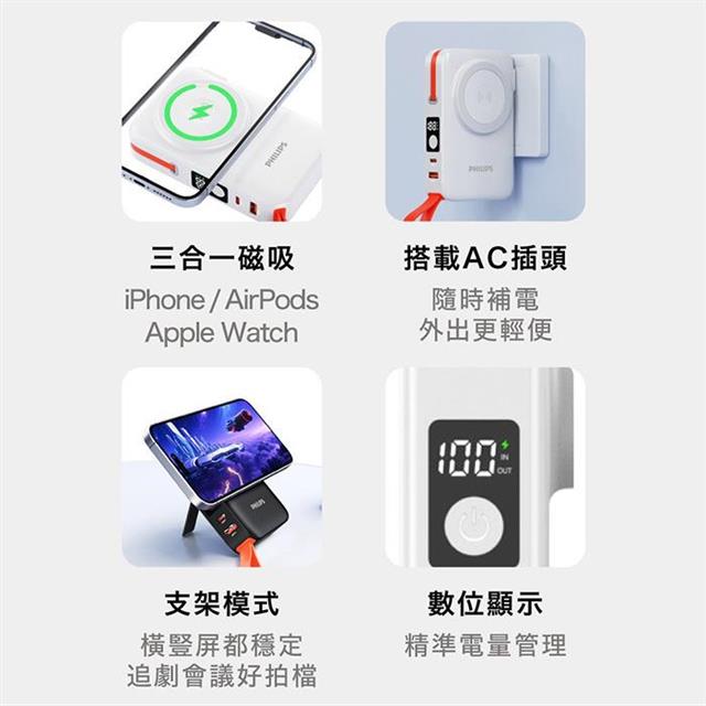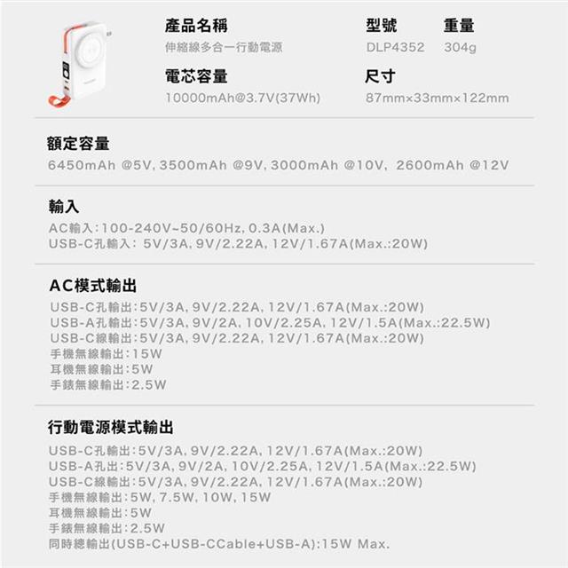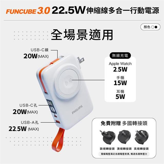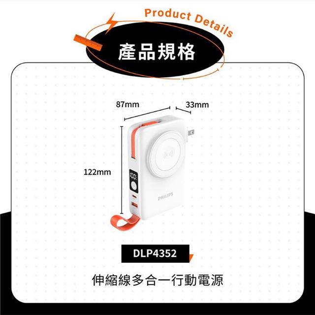 【Philips飛利浦】22.5W伸縮線多合一行動電源 10000mAh (DLP4352C)