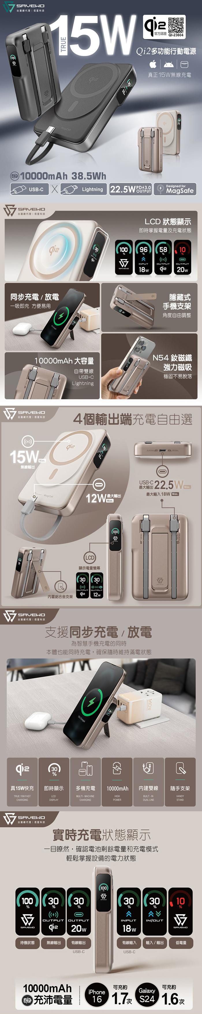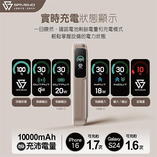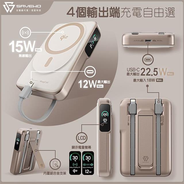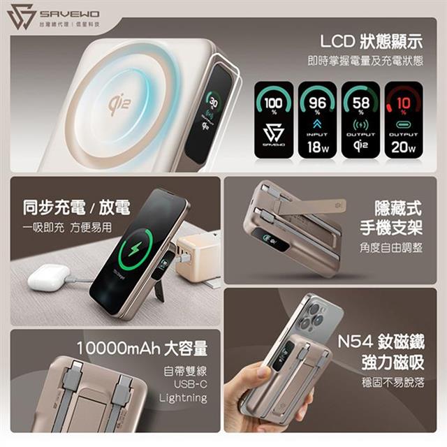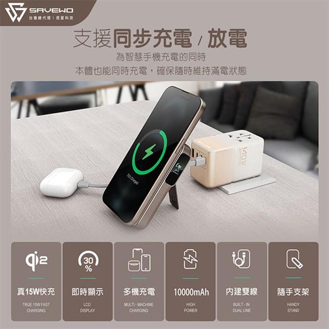 SAVEWO 救世 Qi2 10000mAh多功能行動電源 自帶雙線(有標示Wh 可上飛機)
