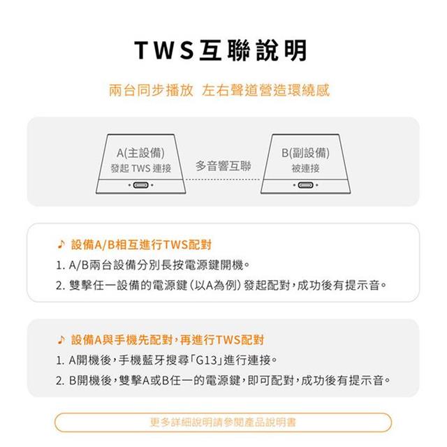 ➣TWS串聯技術,讓聲音覆蓋更廣,組成一對立體聲系統