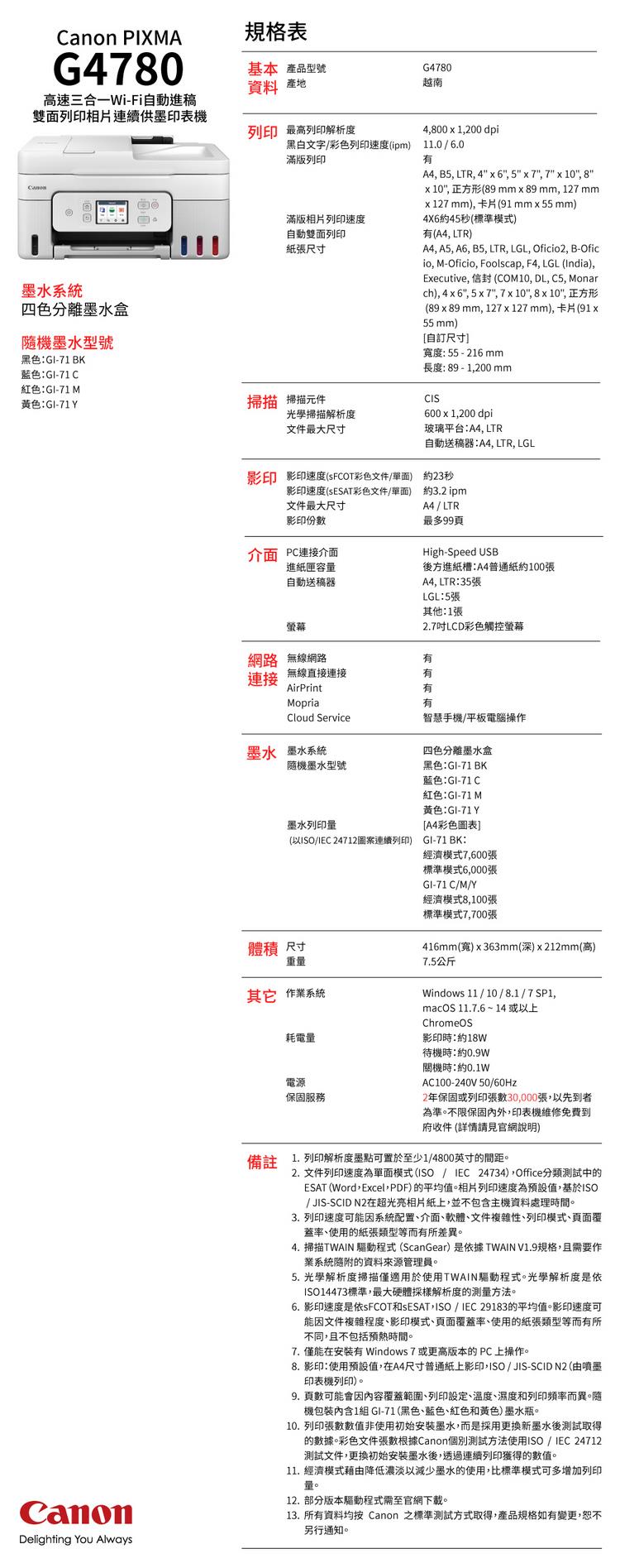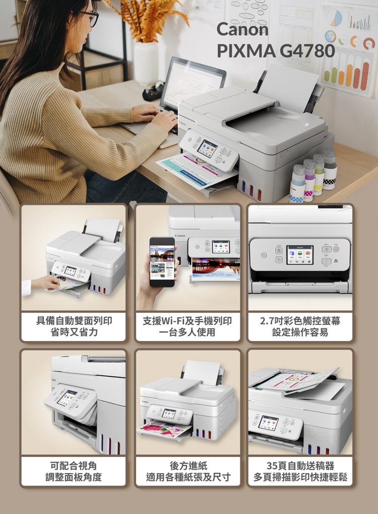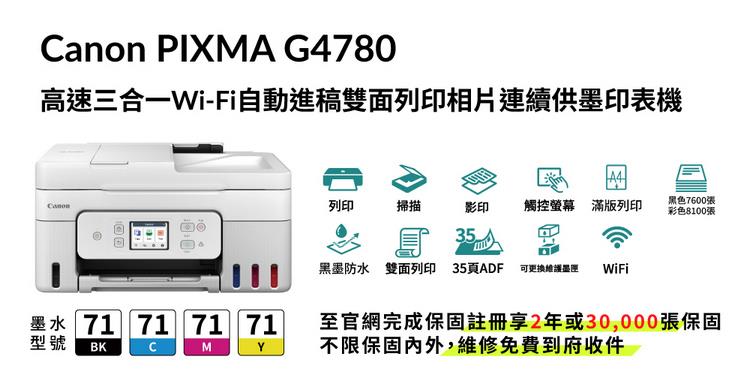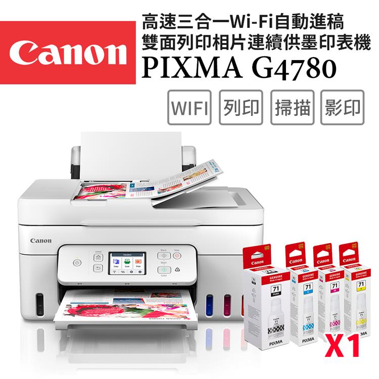 Canon PIXMA G4780 高速三合一Wi-Fi自動進稿雙面列印相片連續供墨印表機+GI-71 PGBK/C/M/Y 墨水組