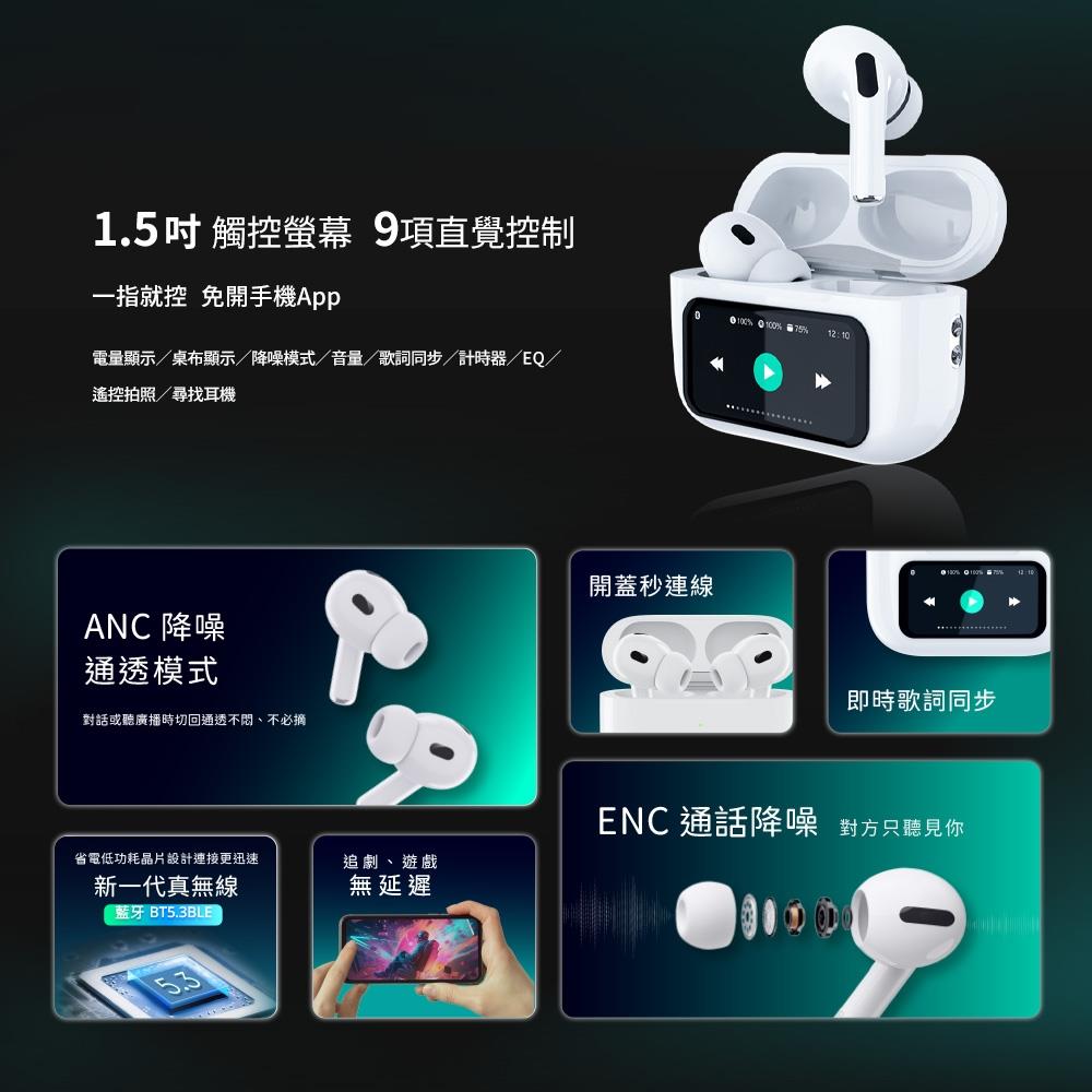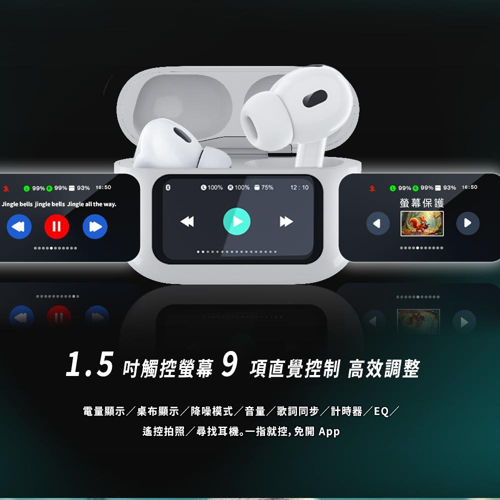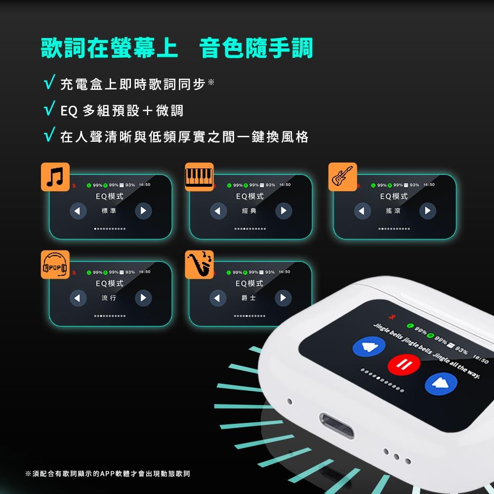 TFT螢幕指示 電池盒:電量顯示/桌布顯示/降噪模式選擇/音量調整/同步歌詞顯示/計時器/EQ均衡器/遙控拍照/尋找耳機