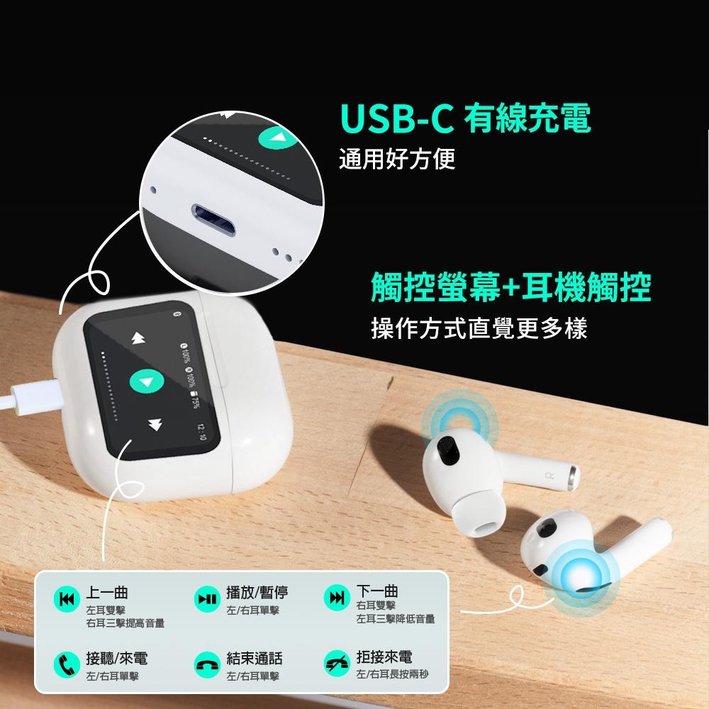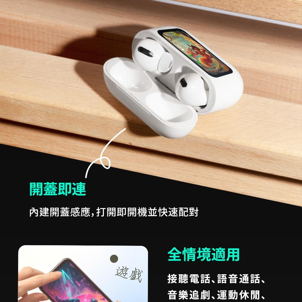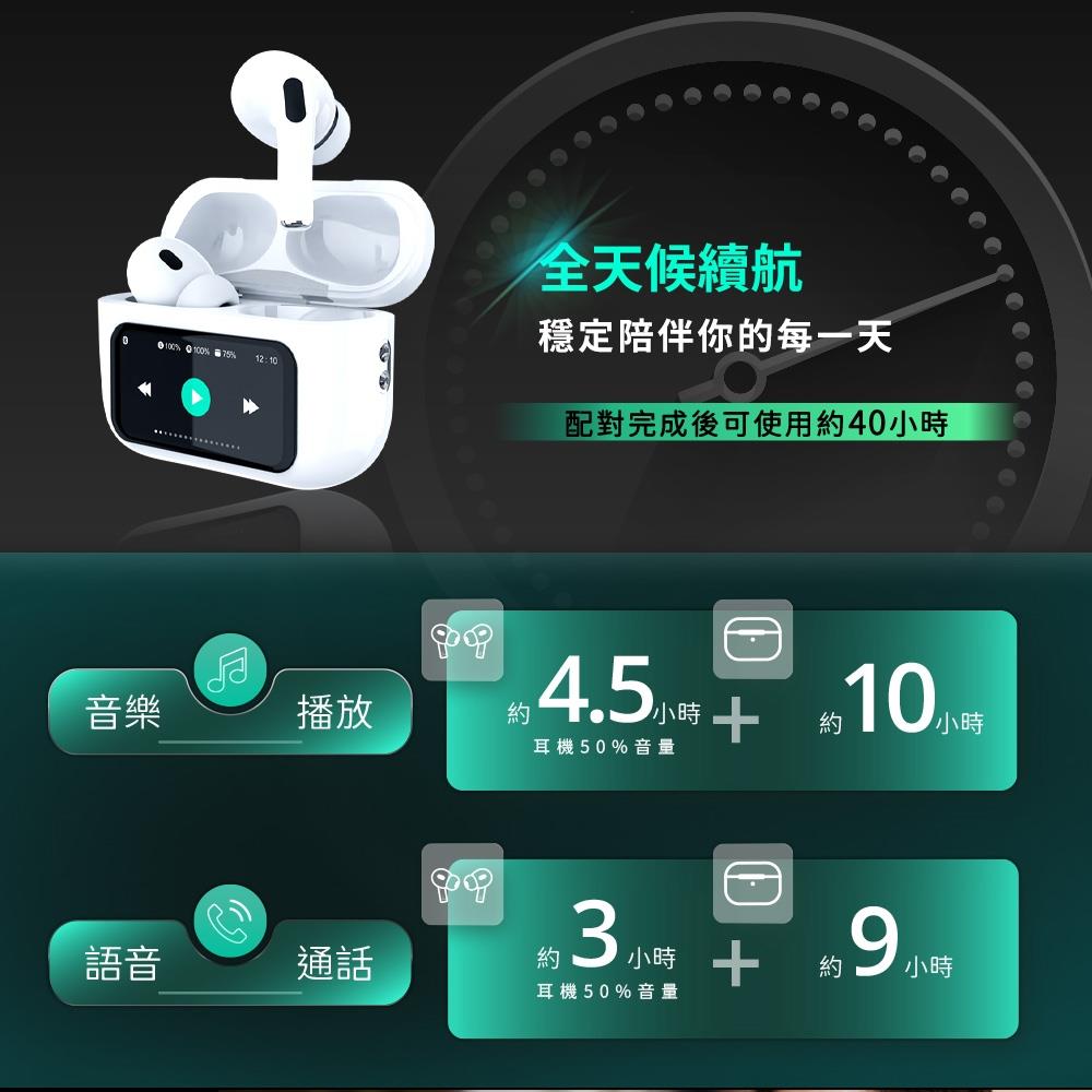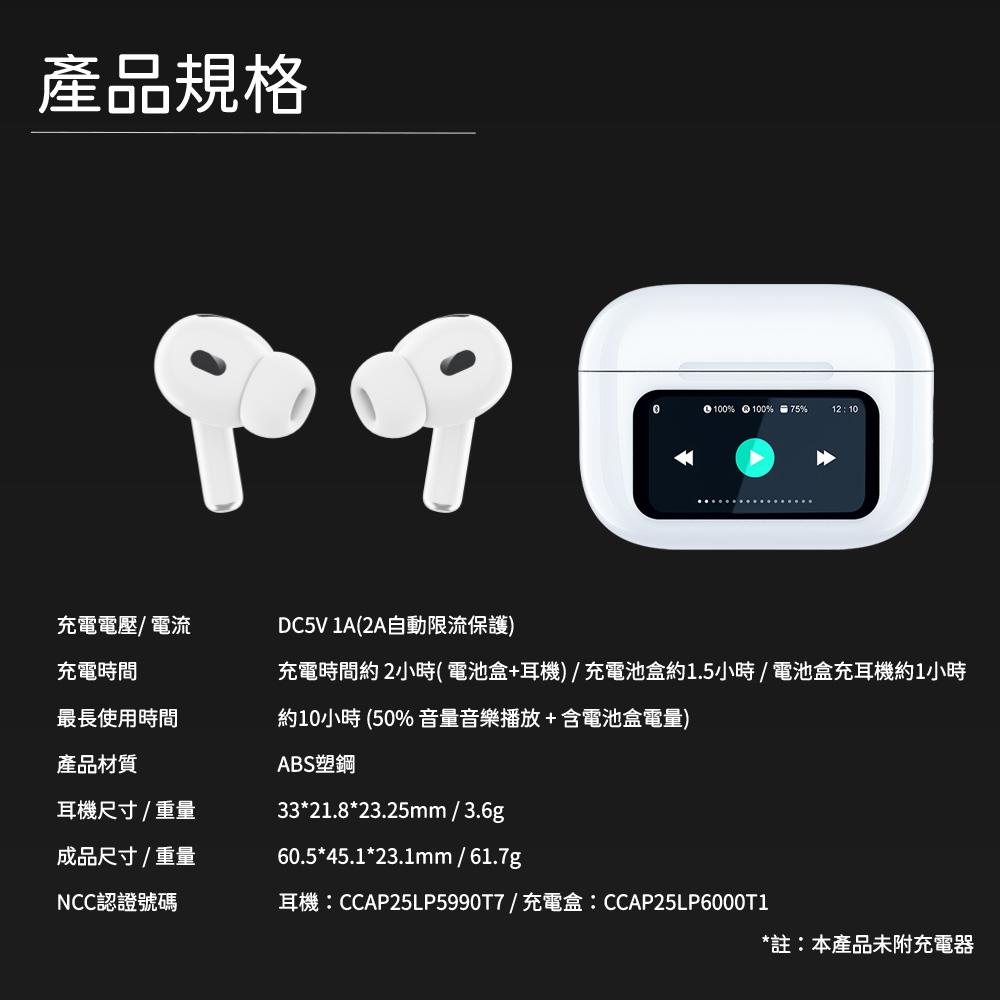 TFT螢幕指示 電池盒:電量顯示/桌布顯示/降噪模式選擇/音量調整/同步歌詞顯示/計時器/EQ均衡器/遙控拍照/尋找耳機