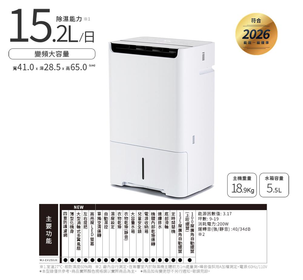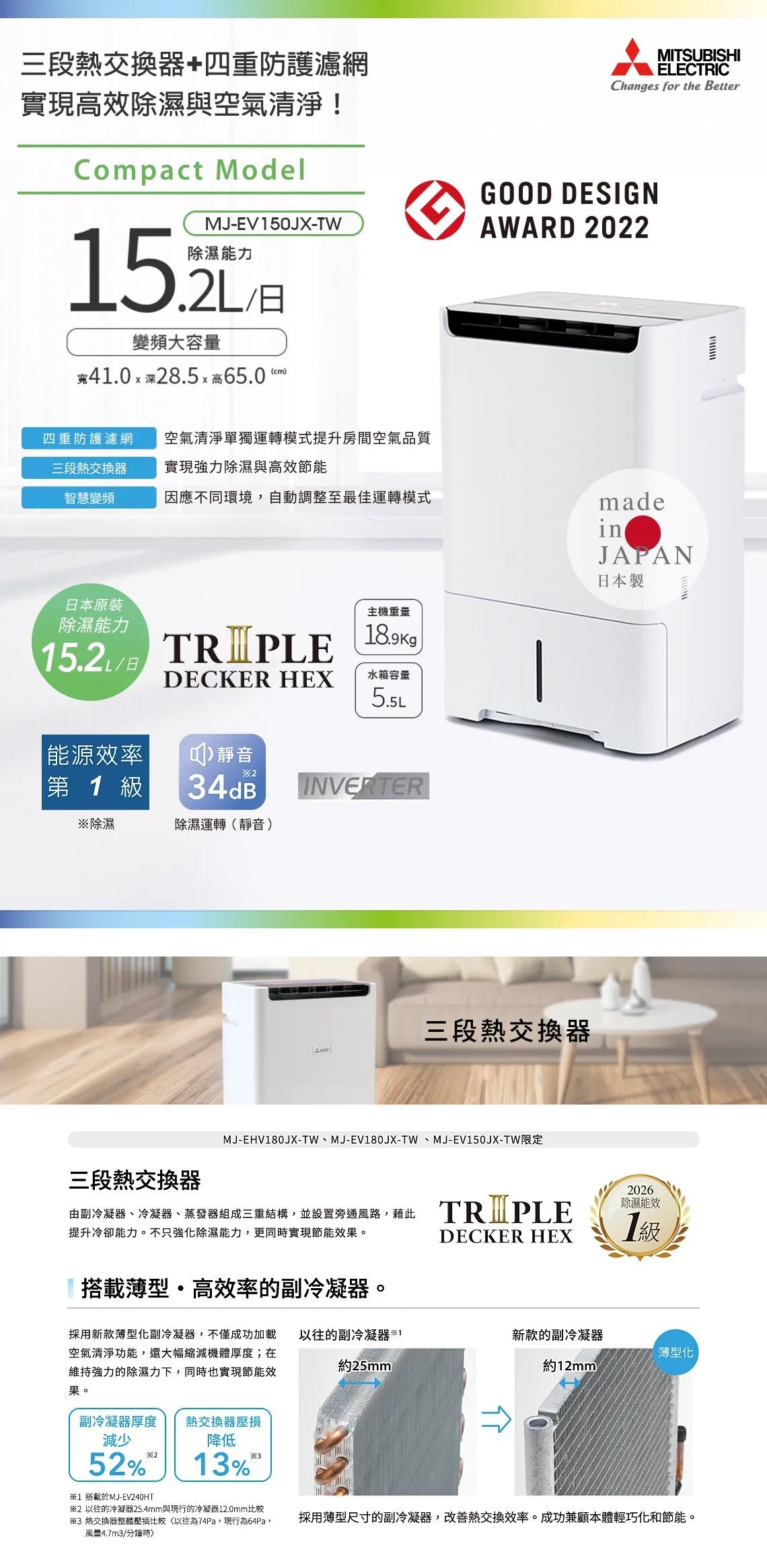 MITSUBISHI三菱 15.2L變頻空氣清淨除濕機 MJ-EV150JX-TW