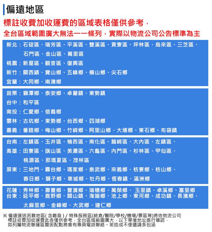 - 偏遠地區、樓層費及其它加價費用,皆由廠商於約定配送時一併告知,廠商將保留出貨與否的權利。