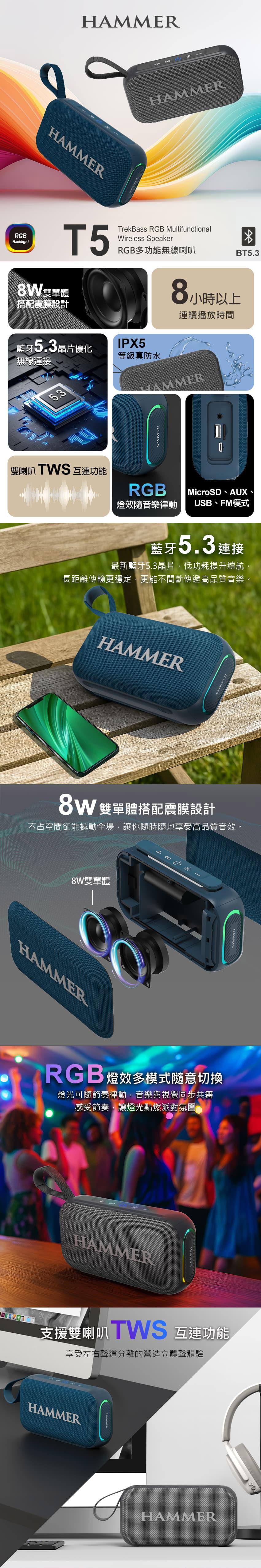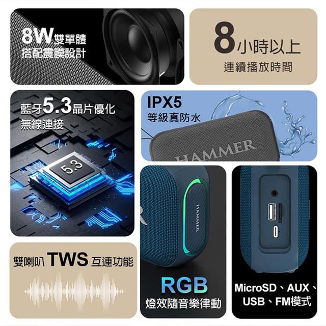 支援藍牙、MicroSD、AUX、USB、FM模式,8W雙單體搭配震膜設計,支援雙喇叭TWS互連功能