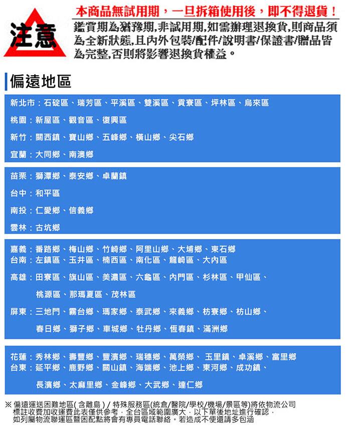 - 偏遠地區、樓層費及其它加價費用,皆由廠商於約定配送時一併告知,廠商將保留出貨與否的權利。