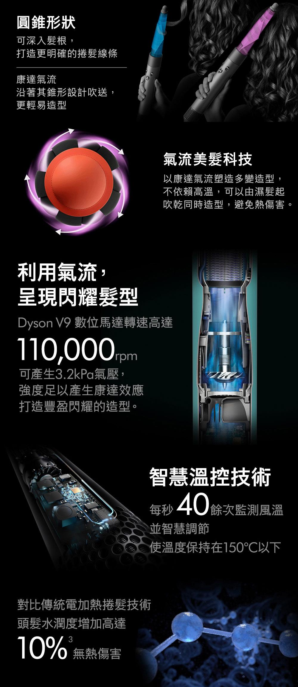 錐形持久髮捲:造型更易貼近髮根,打造漸進捲度,令造型更自然持久。