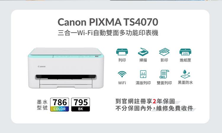 Canon PIXMA TS4070 三合一Wi-Fi自動雙面列印多功能噴墨印表機 (影印/掃描/複合機/適用:PG-795、CL-786墨水)
