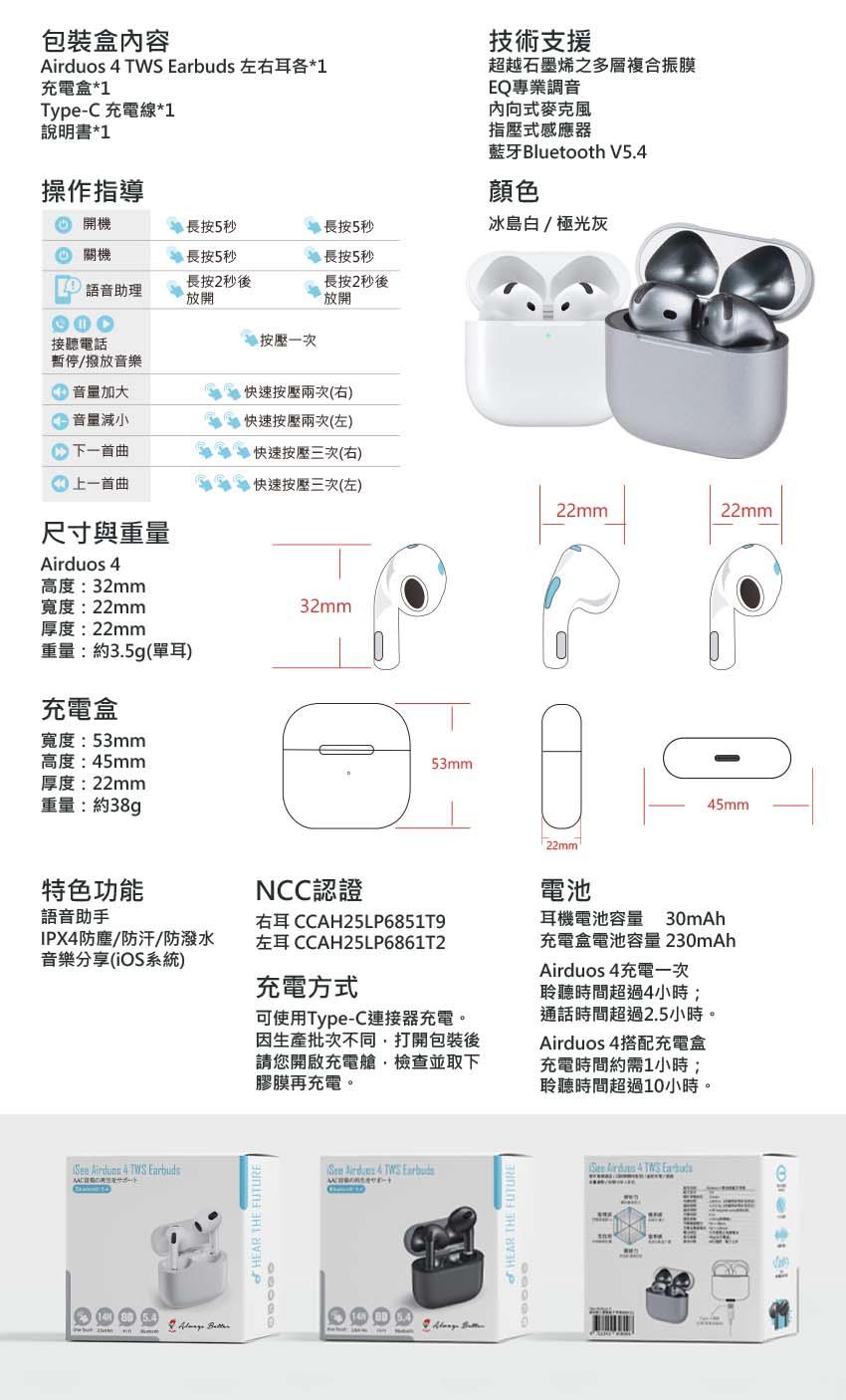 防水等級:IPX4(僅限耳機,充電倉不防水)