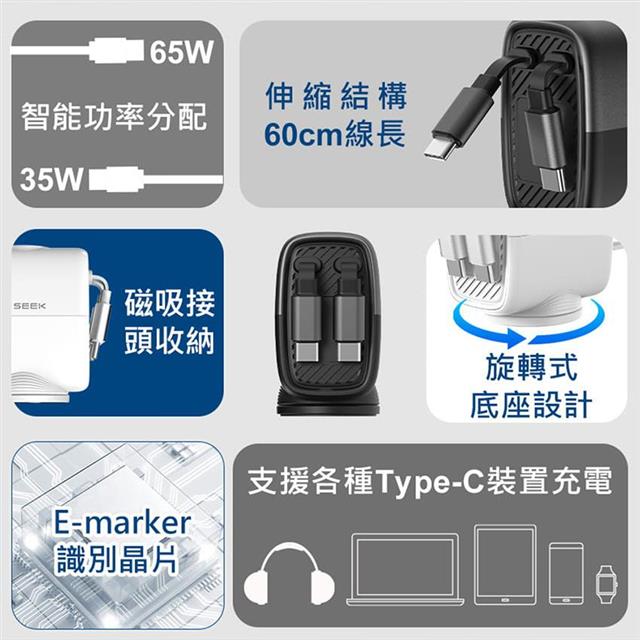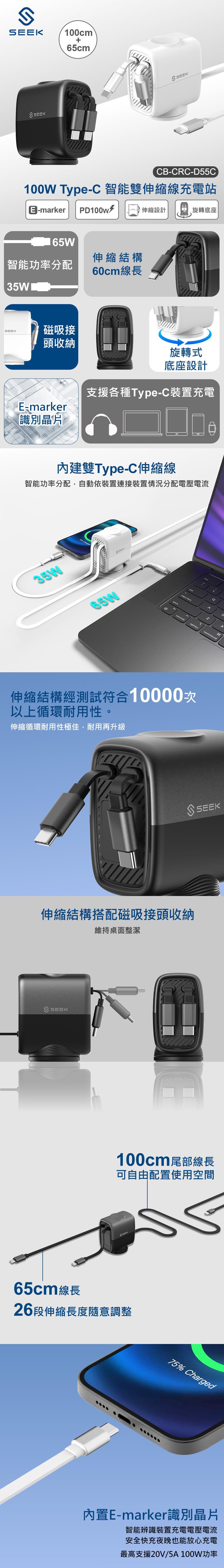 SEEK 100W Type-C智能雙伸縮線充電站(CB-CRC-D55C)