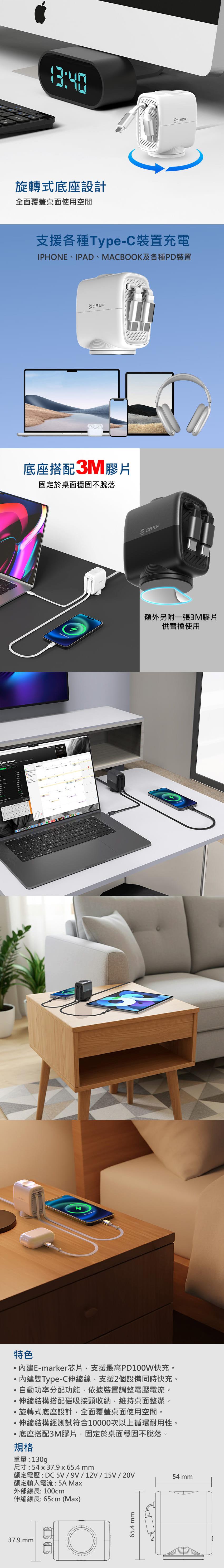 內建雙Type-C伸縮線,支援2個設備同時快充