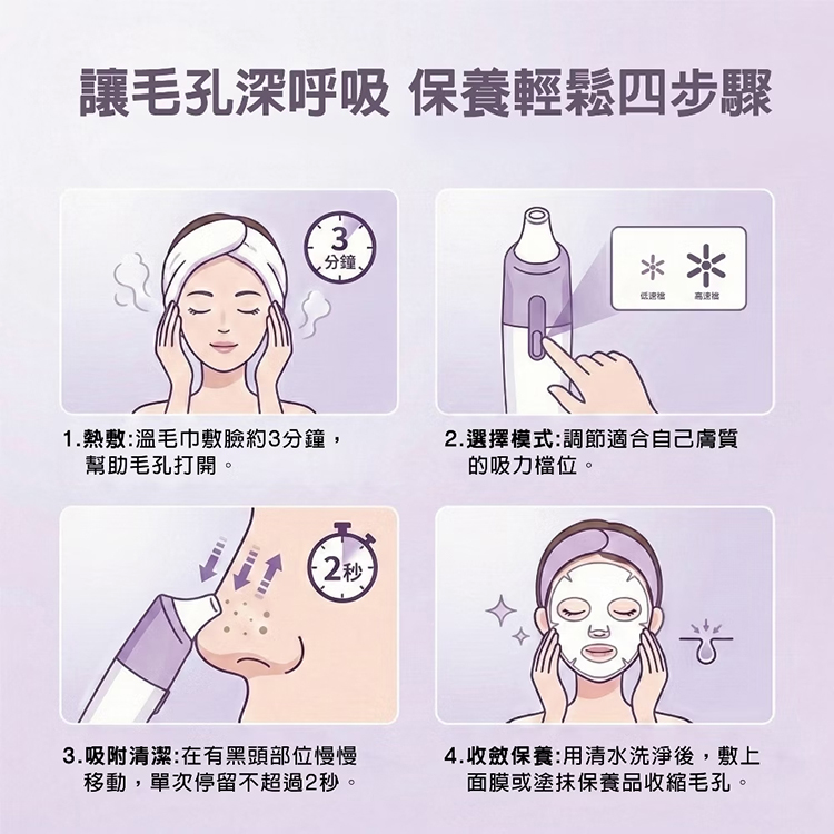提供高、低兩段吸力模式,可依照膚質敏感度或使用區域自由切換