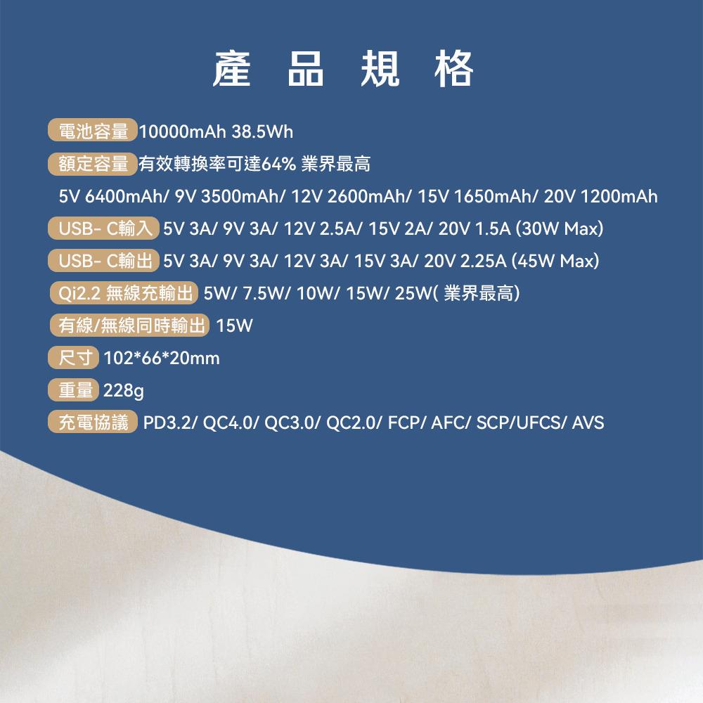 無線充電輸出 5W/ 7.5W/ 10W/ 15W/ 25W(MPP) 無線充自動喚醒技術