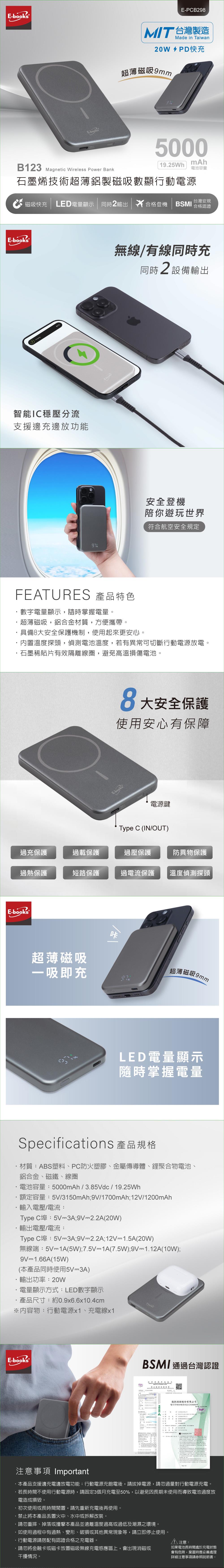 E-books B123 MIT 5000mAh 石墨烯 超薄鋁製 磁吸快充 數顯 行動電源