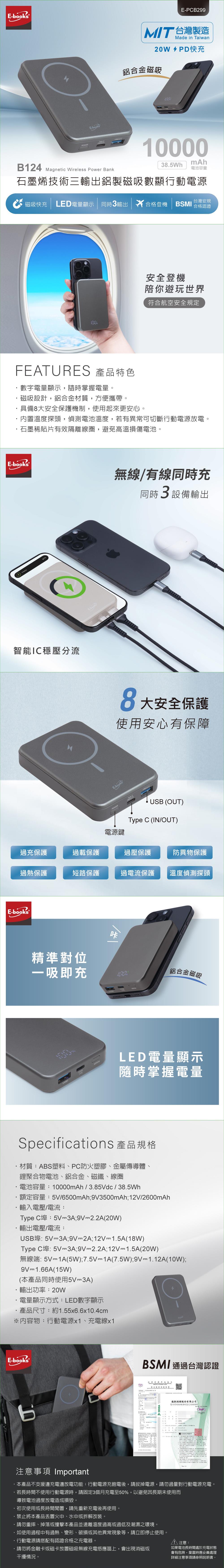 E-books B124 MIT 10000mAh 石墨烯 鋁製 磁吸快充 數顯 行動電源