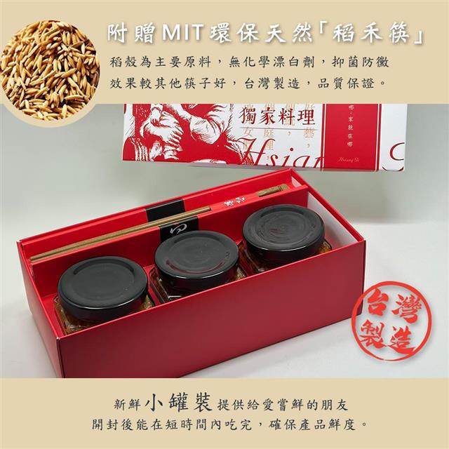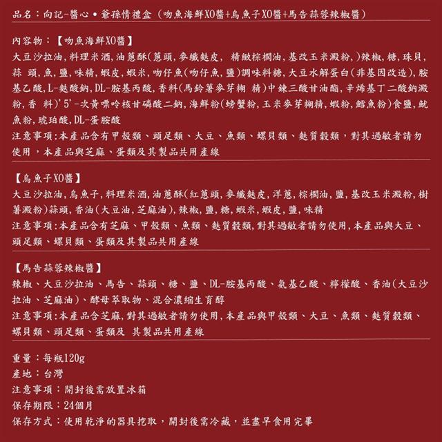 備註:向記所有食品皆不含防腐劑,經SGS檢驗合格,全面使用華夏玻璃專用食品用瓶,經高溫充填並採機器真空包裝,敬請安心使用。