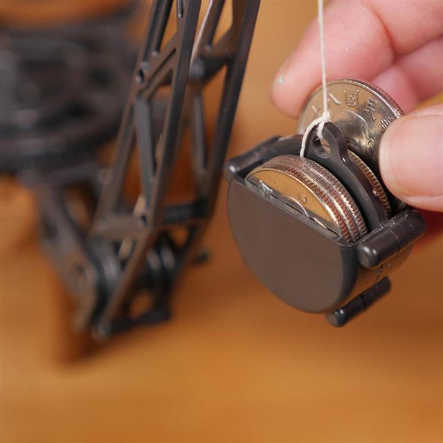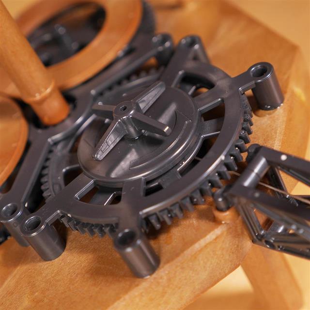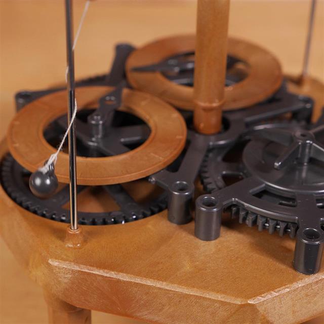 原始時鐘是由重量來調節動作,使掛著小金屬球的繩子規律地在兩側的柱子上纏繞後展開,形成