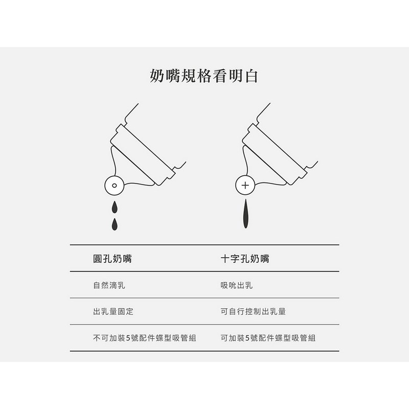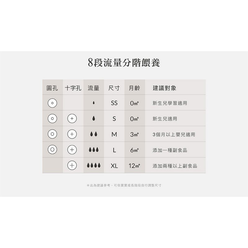 防脹氣奶嘴尺寸業界規格最齊全,8段流量分階餵養。