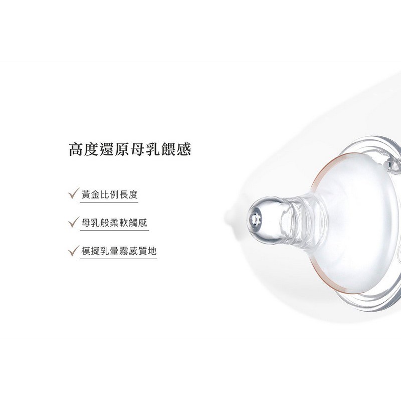 高度還原母乳餵感,奶嘴黃金比例長度、柔軟觸感、模擬乳暈霧化設計。