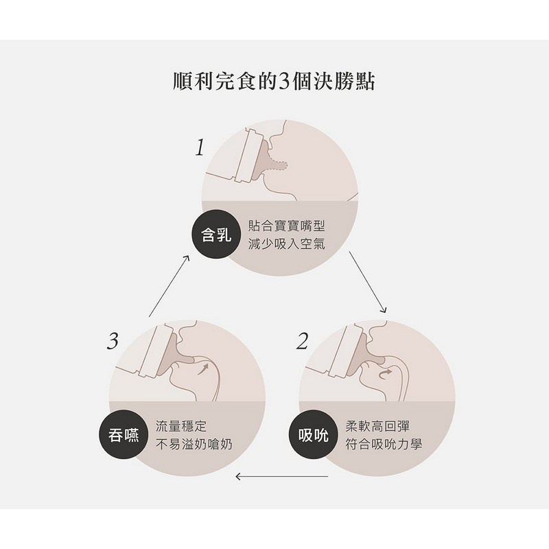 高度還原母乳餵感,奶嘴黃金比例長度、柔軟觸感、模擬乳暈霧化設計。