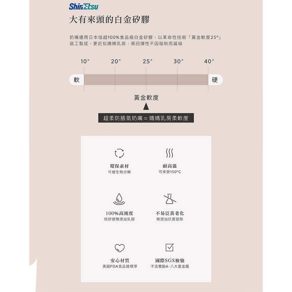 選用日本信越100%食品級白金矽膠,高回彈性不因吸吮而扁塌。