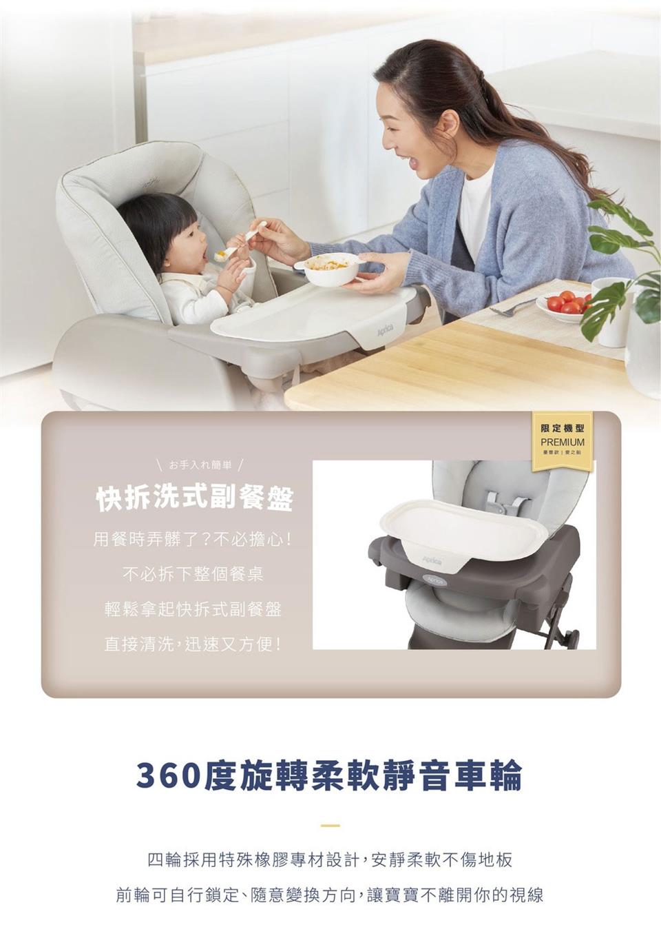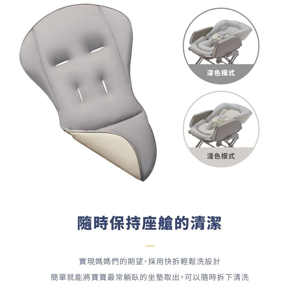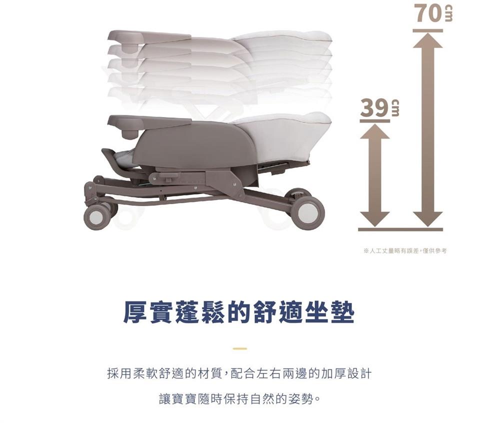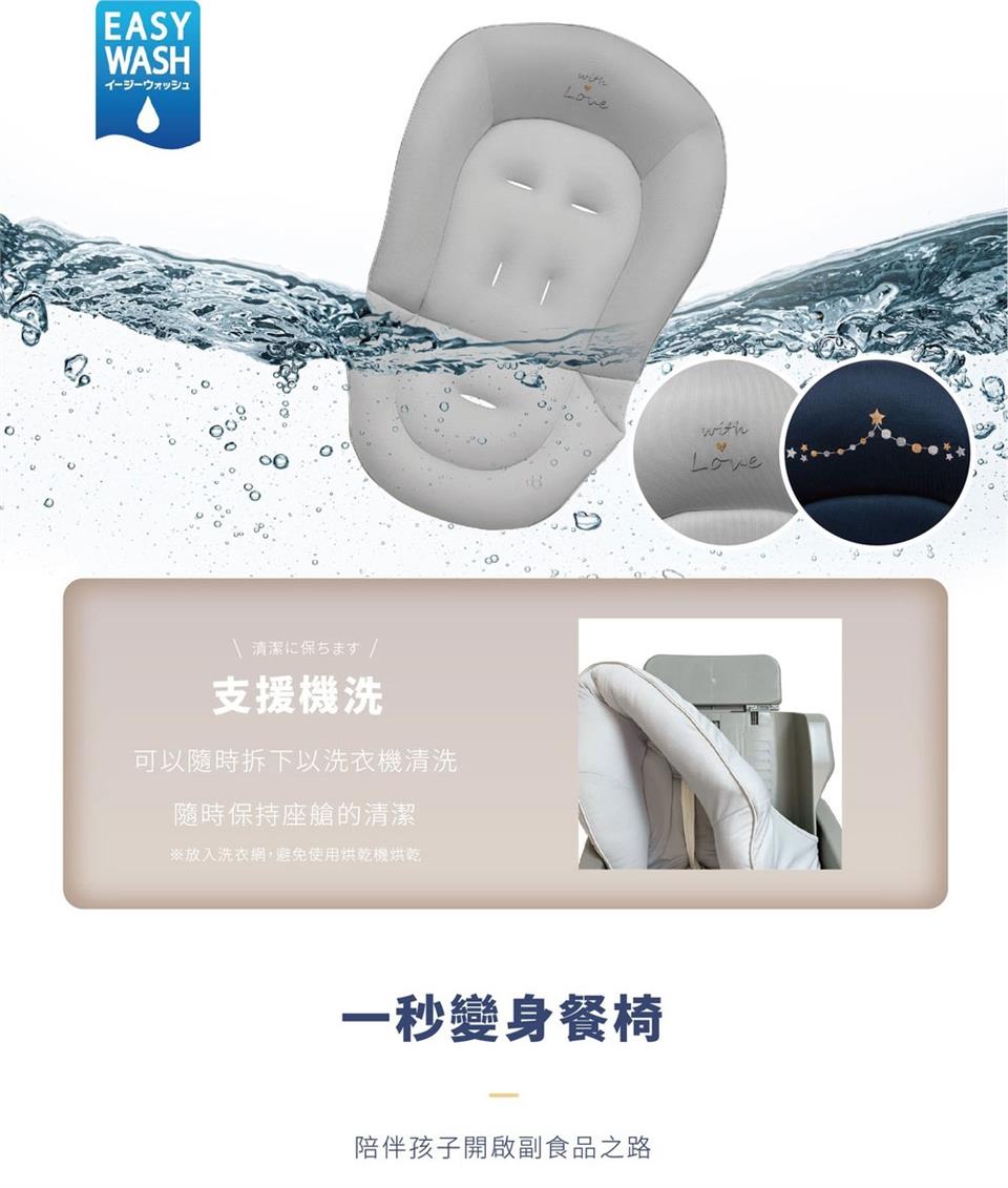 搭載「厚實蓬鬆的全身型雙面坐墊」,並且採用「快拆式可機洗坐墊」功能,減輕媽媽的負擔。