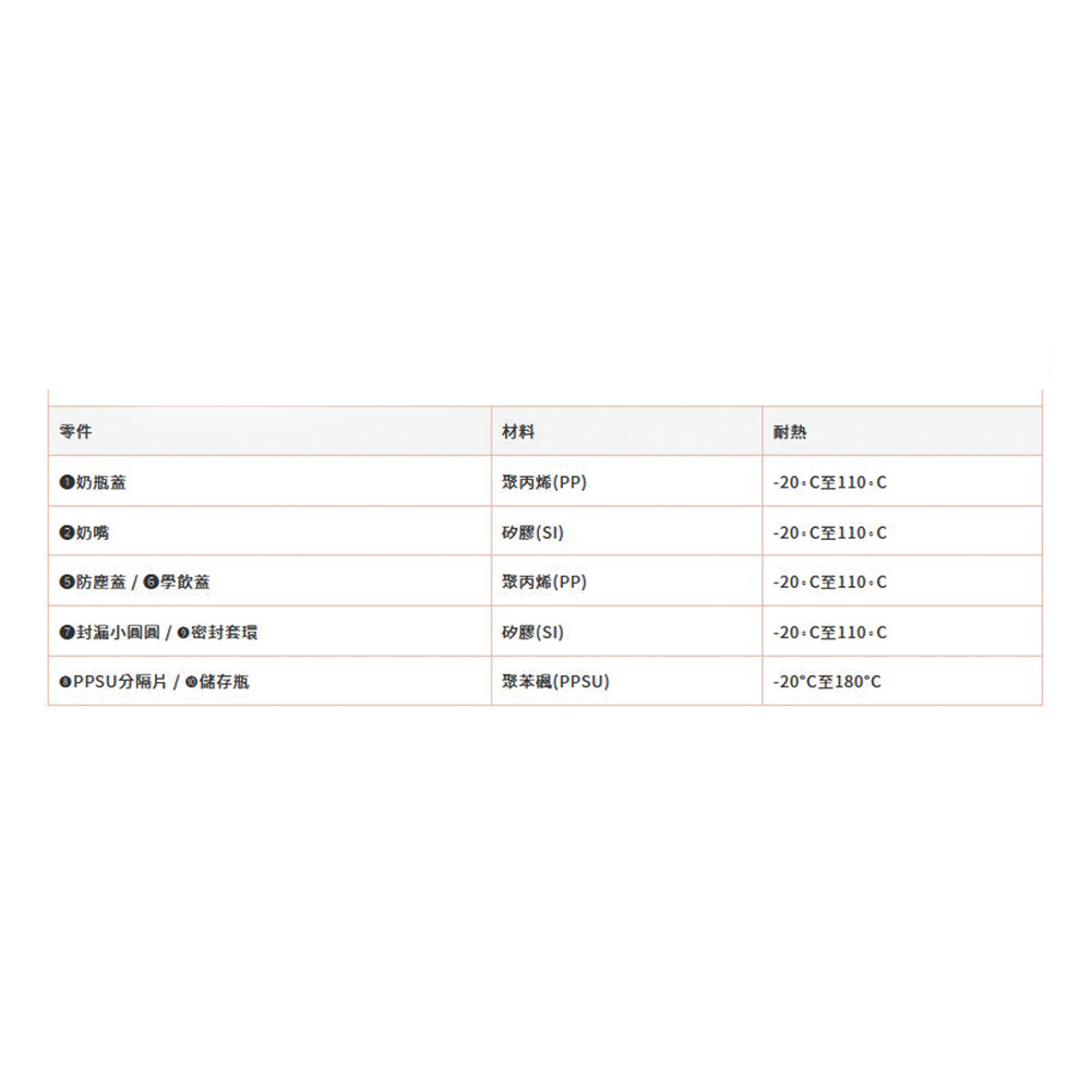 材質:聚苯碸(PPSU)、矽膠(SI)、聚丙烯(PP)