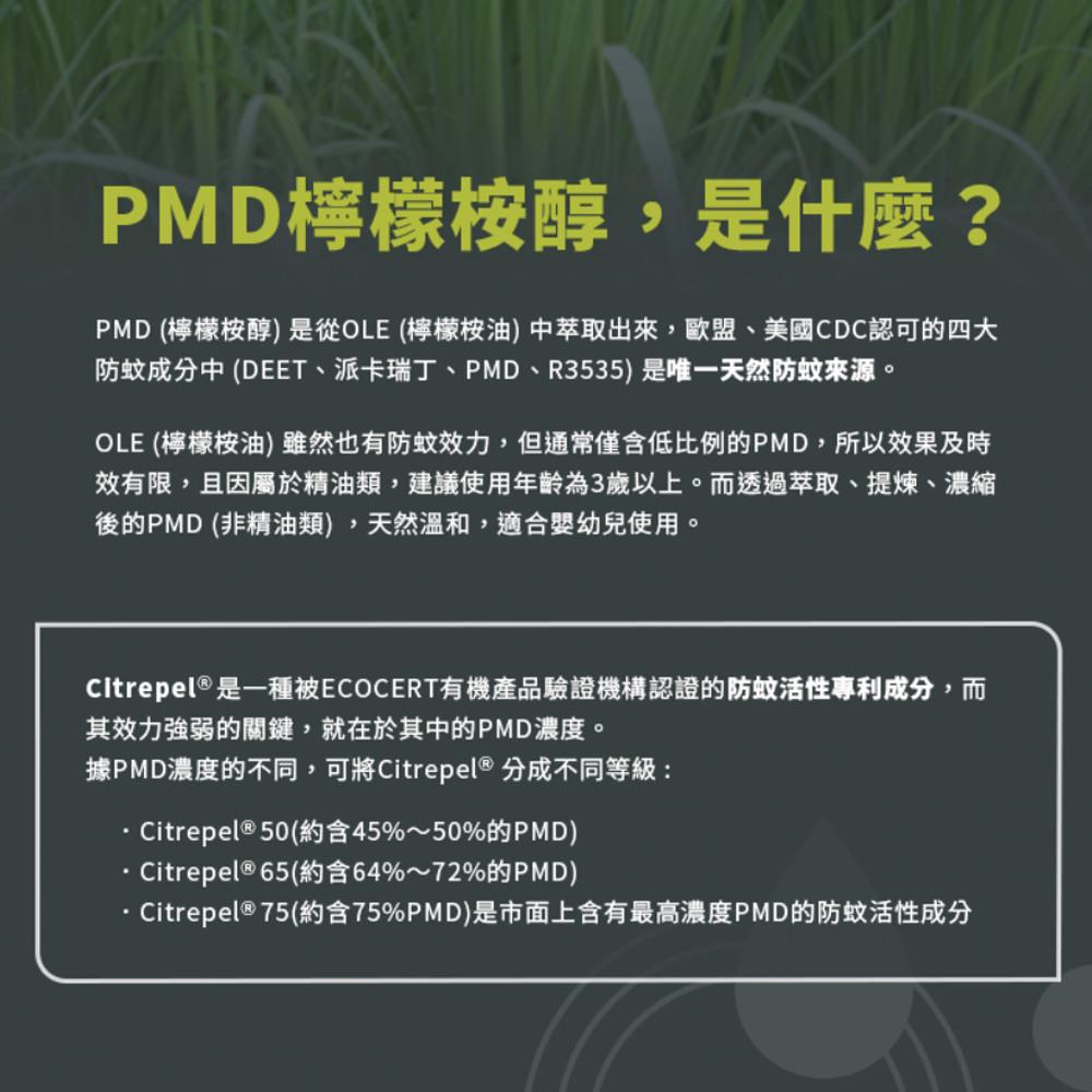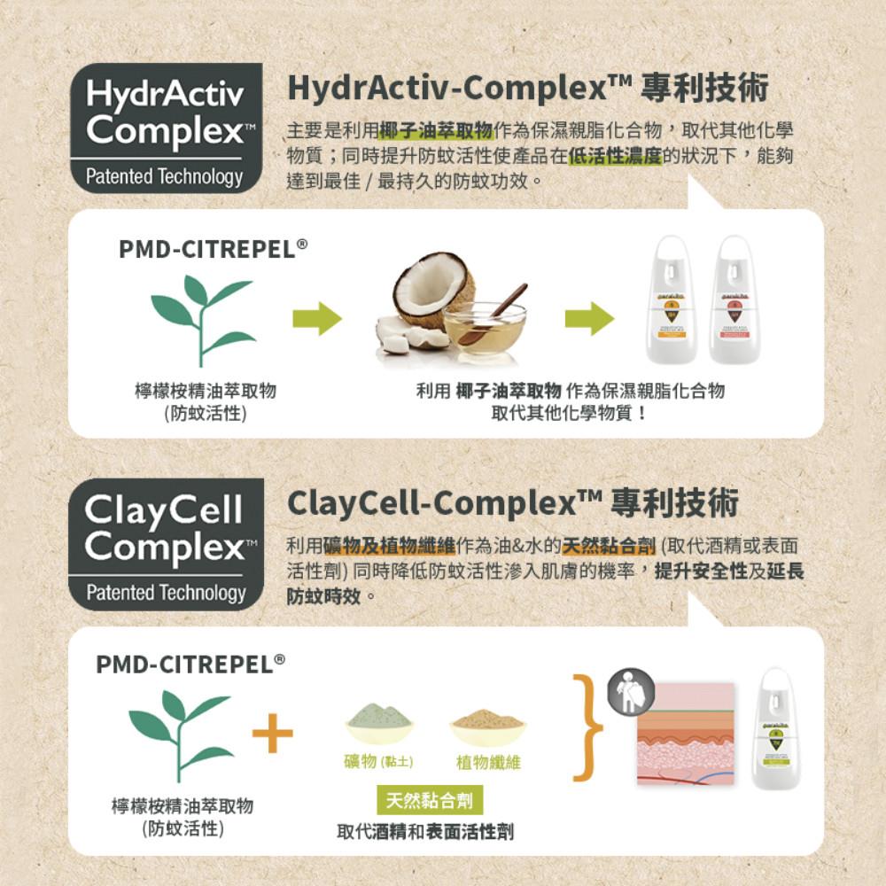 天然檸檬桉植物萃取物(PMD-Citrepel®)、純水、甜杏仁油、椰油醇辛酸酯/癸酸酯、牛油果樹果脂萃取、生育酚、微晶懺維素(85%)、酶水 解羧甲基哦維素 (15%)、皂土、甘油3-磷酸、二氫茉莉酮酸甲醋、檸檬酸