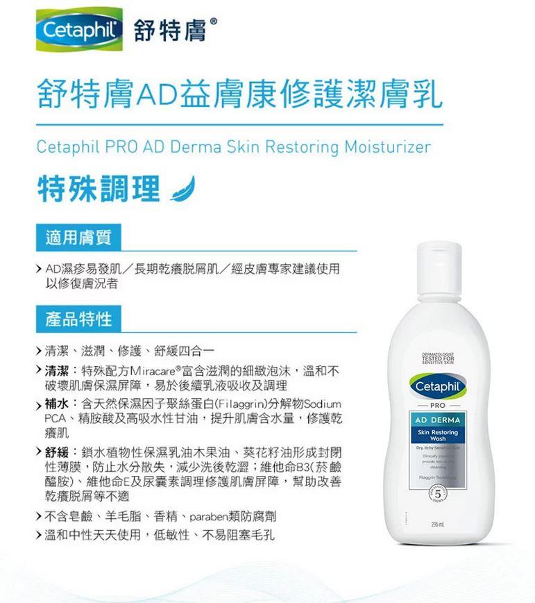 使用方法:可天天用於臉部及全身。請充分搓揉於沾濕的肌膚上並沖起乾淨,再搭配AD益膚康修護潔膚乳使用,加強肌膚保濕。