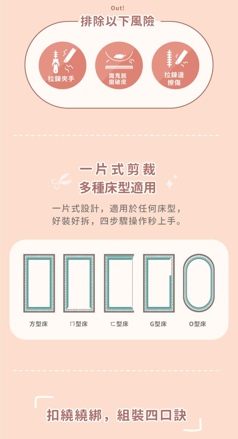 一片式裁剪,適用於任何床型,好裝好拆,四步驟操作秒上手