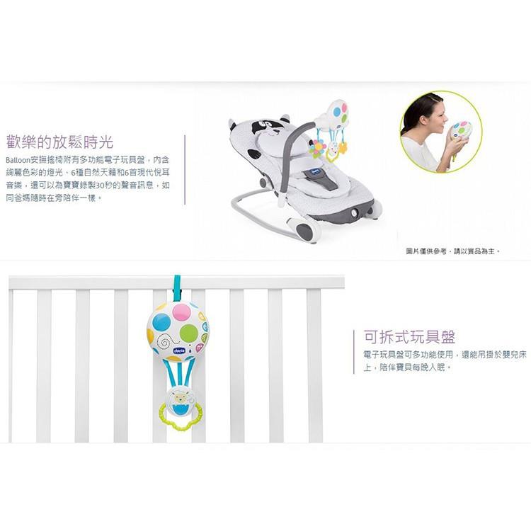 Balloon安撫搖椅附有多功能電子玩具盤,內含絢麗色彩的燈光、6種自然天籟和6首現代悅耳音樂,還可以為寶寶錄製30秒的聲音訊息,如同爸媽隨時在旁陪伴一樣。