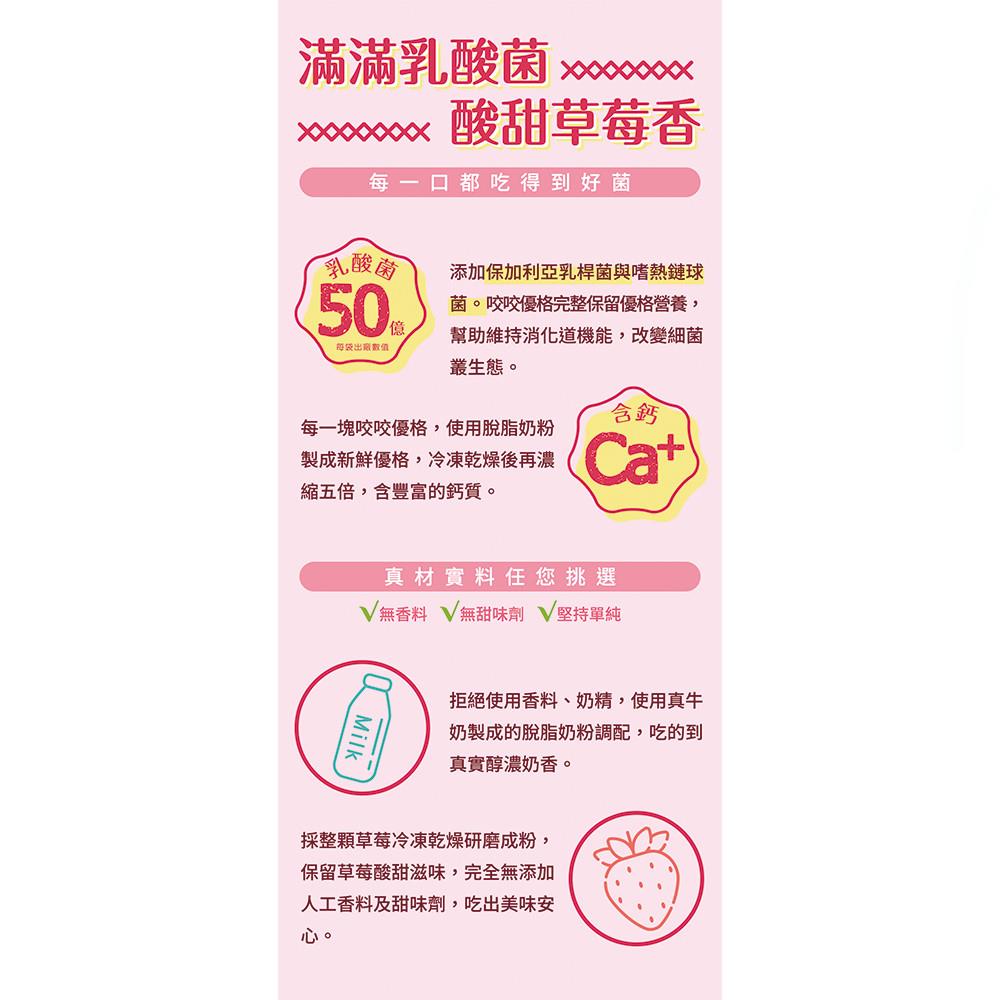 內容物:冷凍乾燥優格塊-草莓(優格(脫脂奶粉、保加利亞乳桿菌、嗜熱鏈球菌)、砂糖、冷凍乾燥草莓粉)
