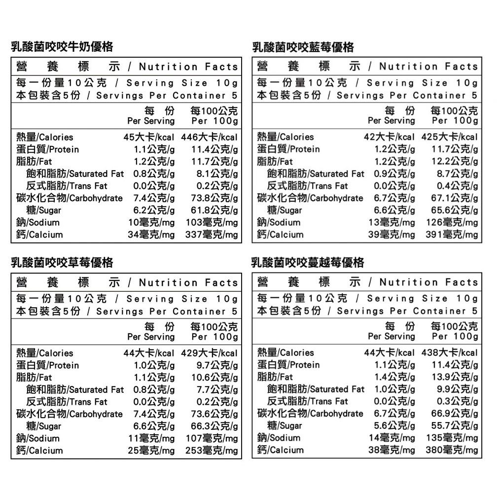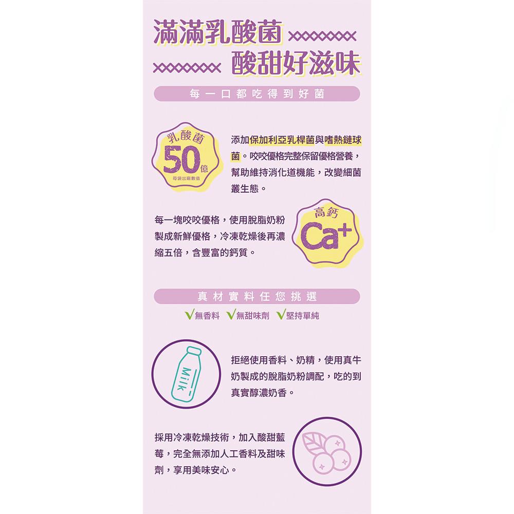 內容物:冷凍乾燥優格塊藍莓優格脱脂奶粉、保加利亞乳桿菌、嗜熱鏈球菌、砂糖、冷凍藍莓