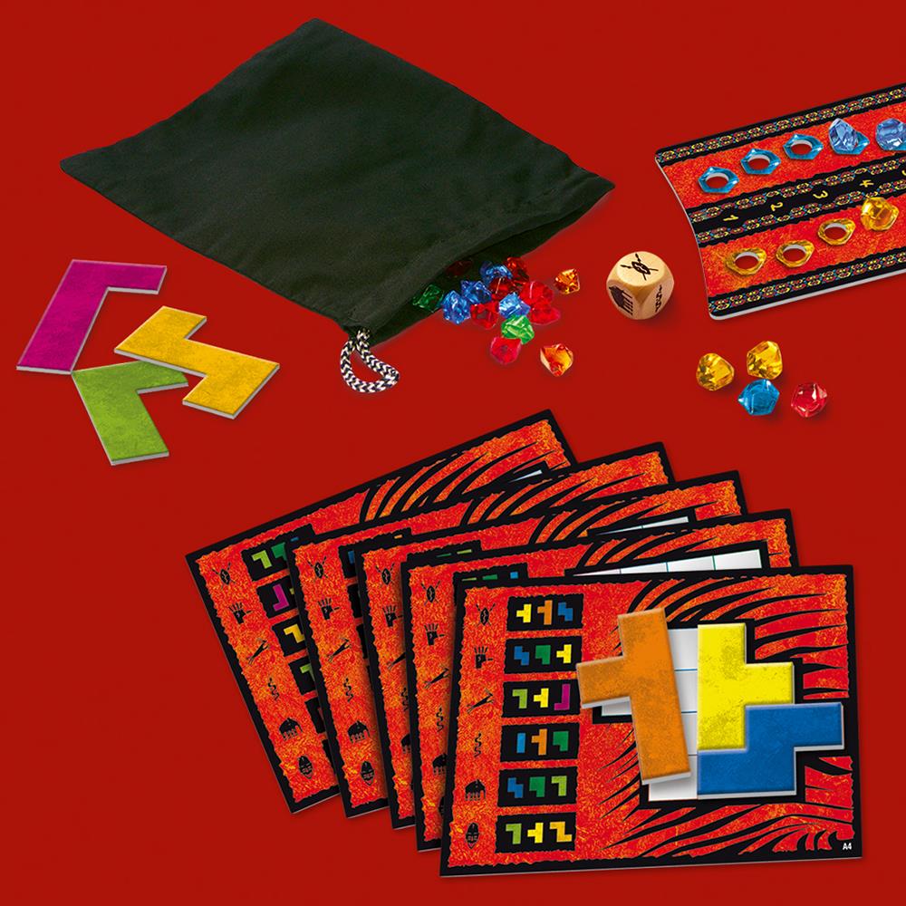 遊戲進行方式:每位玩家拿取一套共12片的幾何板塊,每片形狀不同的板塊都由多個大小相同的正方形所組成。回合開始時,每位玩家拿取一張新的拼圖板,一位玩家擲骰決定必須用哪些板塊填滿拼圖板上的空格,在時限內完成的人大喊「烏邦果」,接著從袋子裡隨機拿取一顆寶石。最快完成的人可以額外獲得一顆藍寶石,次快完成的人可以額外獲得一顆黃寶石。不同顏色寶石帶來不同分數,九回合後,得分最高的玩家獲勝。