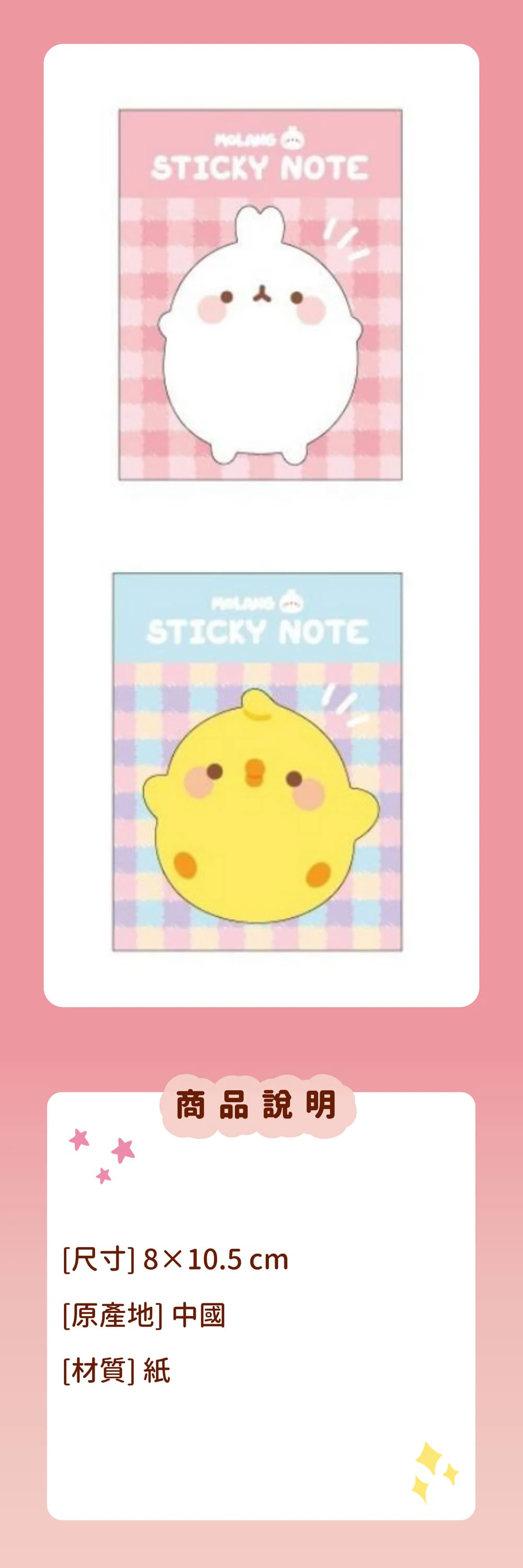 萌浪兔MOLANG造型便條紙,讓你的記事本也能添一點可愛風!PiuPiu小黃雞也加入了,兩款造型任你選。快來為你的筆記本增添一絲趣味吧!