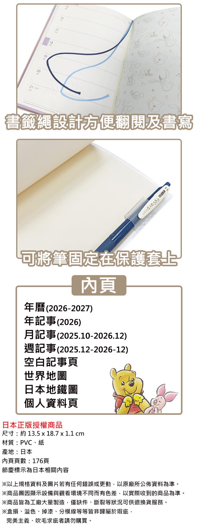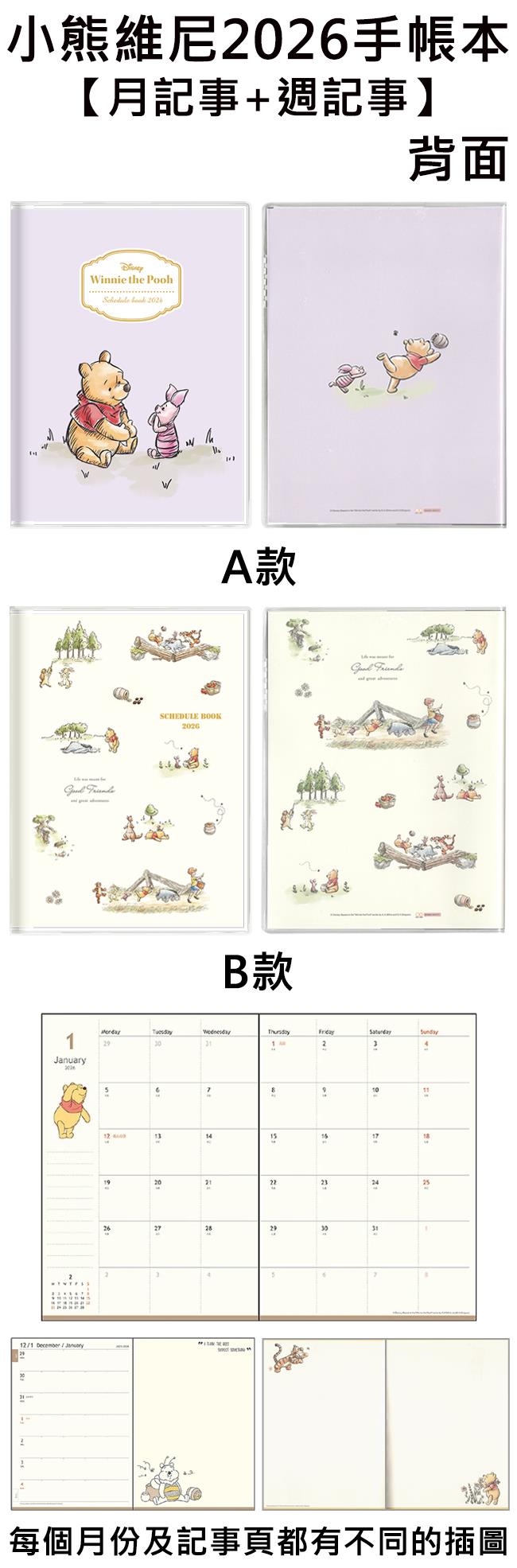 小熊維尼 2026手帳本 日本製 月記事手帳 週記事手帳 跨年手冊 記事本 行事曆 維尼