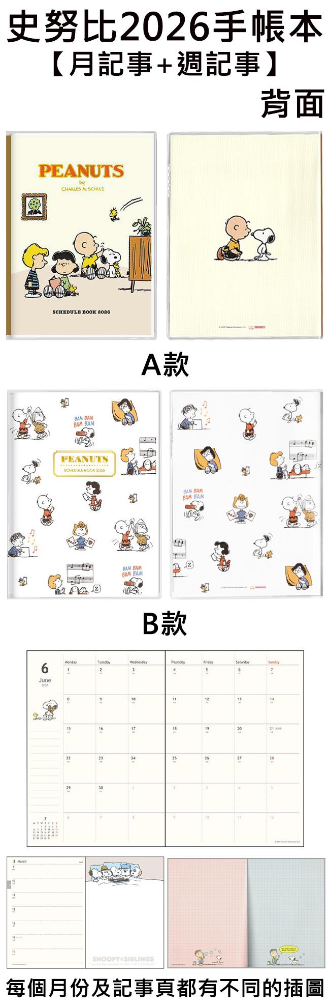 史努比 2026手帳本 日本製 月記事手帳 週記事手帳 跨年手冊 記事本 行事曆 Snoopy