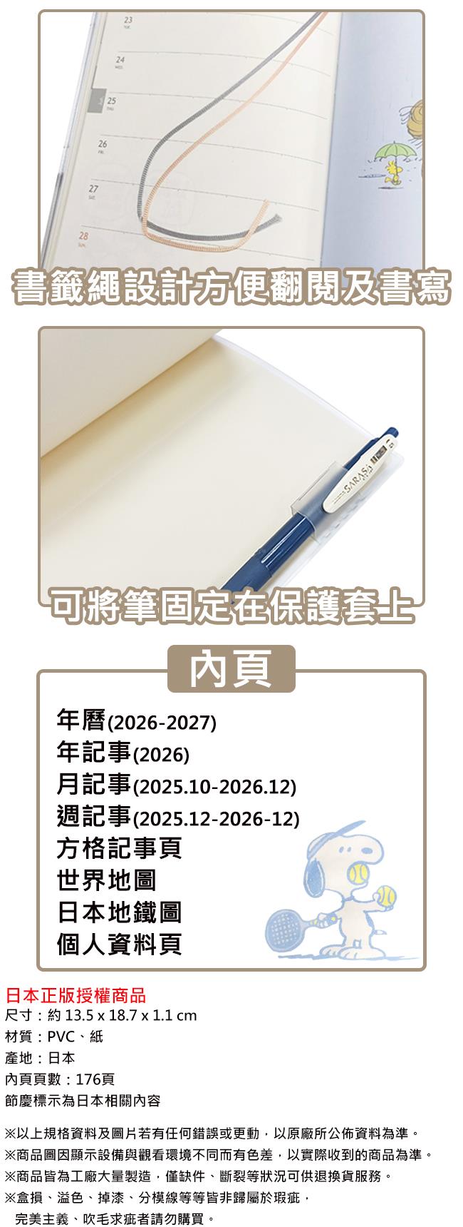 日期自2025.10至2026.12<br> 內頁以月記事、週記事格式為主<br> 節慶標示、資訊頁皆為日本相關內容<br> 日本正版授權商