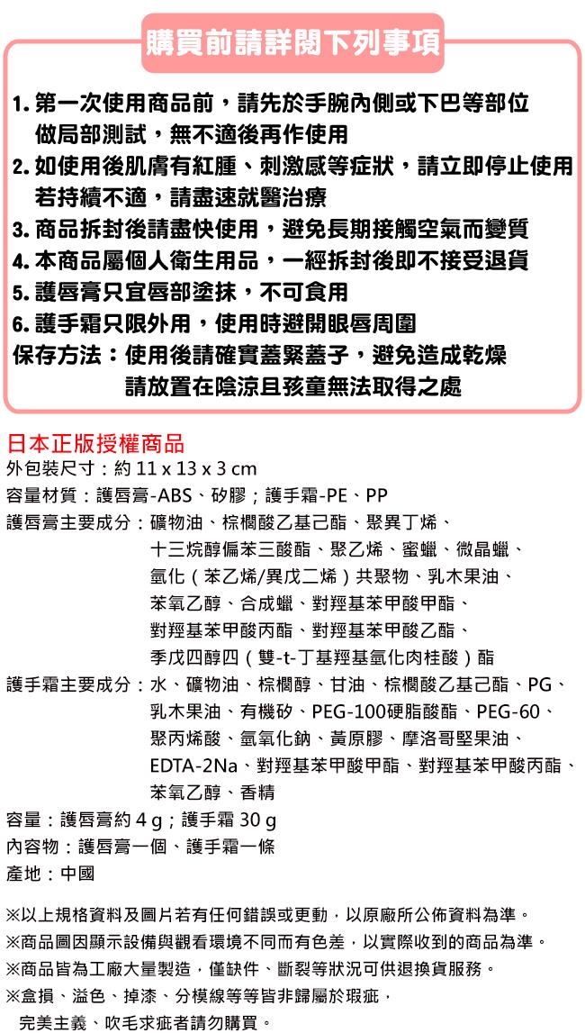 唇部、手部保養一次到位<br> 每個人物對應不同的香味<br> 精美外包裝送禮自用皆相宜<br> 日本正版授權商品