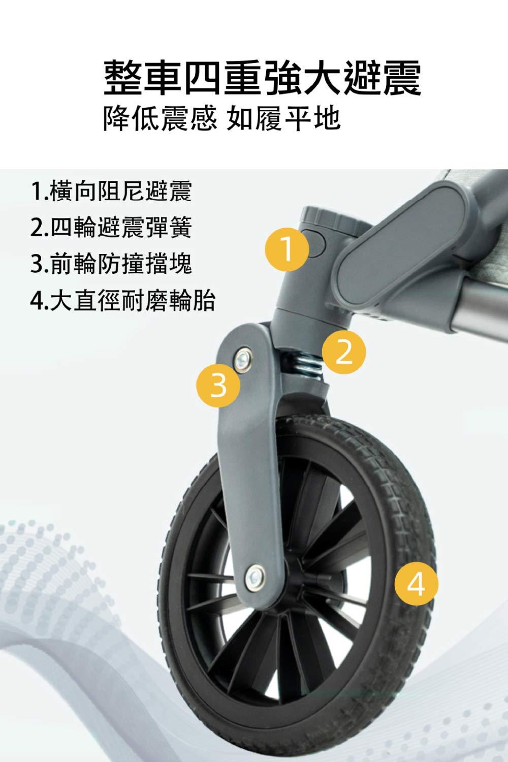 可拆卸式加高雙向座椅、可斜躺、可拆式頂棚、減震輪胎