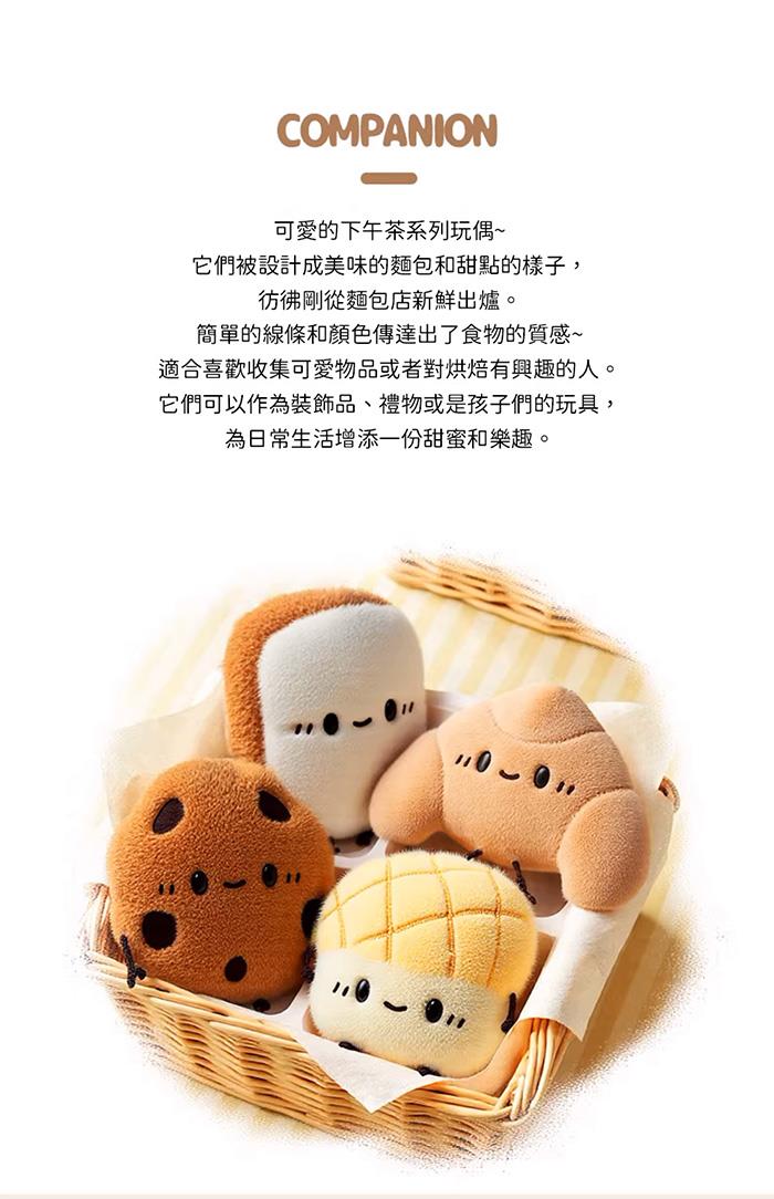 可愛的下午茶系列玩偶~ 它們被設計成美味的麵包和甜點的樣子, 彷彿剛從麵包店新鮮出爐。 簡單的線條和顏色傳達出了食物的質感~ 適合喜歡收集可愛物品或者烘焙有興趣的人。