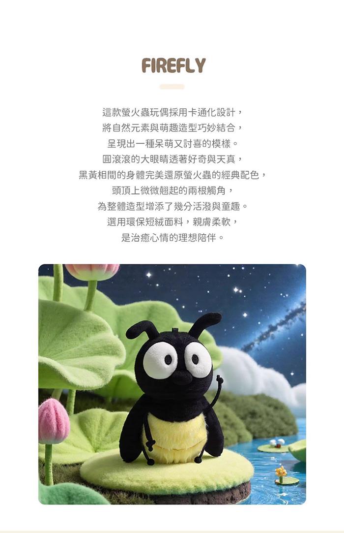 採用卡通化設計, 將自然元素與萌趣造型巧妙結合, 呈現出一種呆萌又討喜的模樣。 圓滾滾的大眼睛透著好奇與天真, 保留昆蟲們的標誌性配色, 同時融入Q版童趣。
