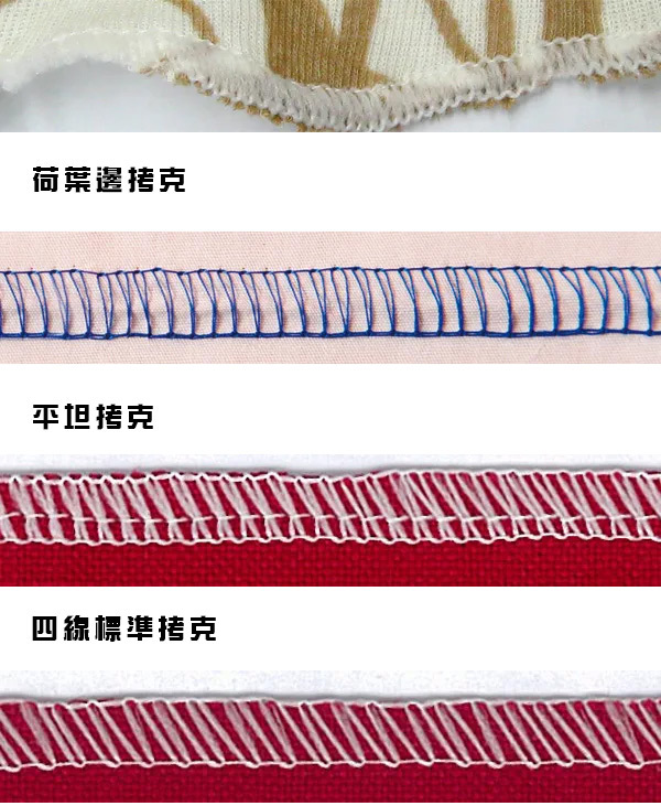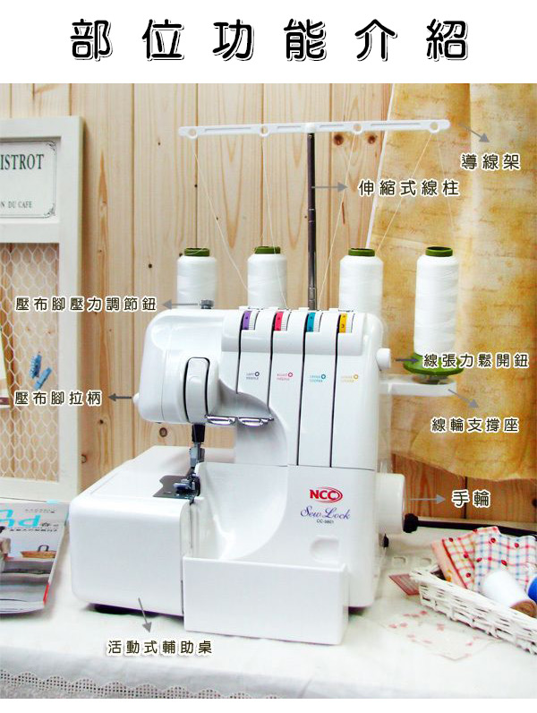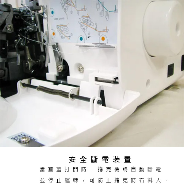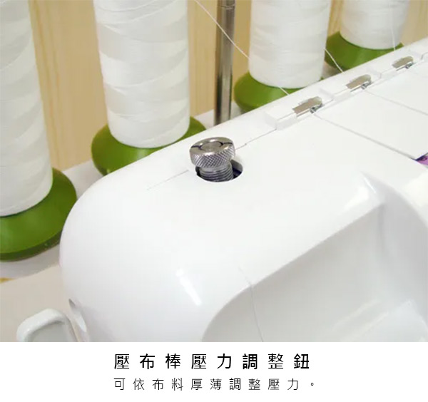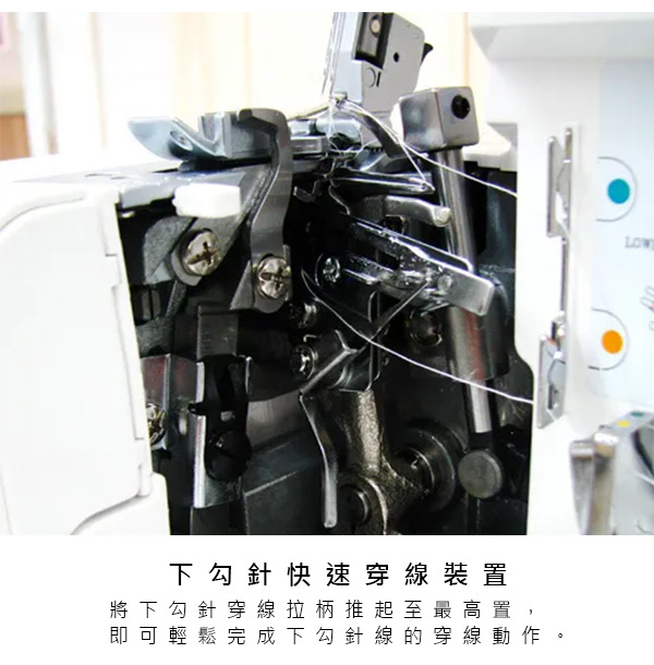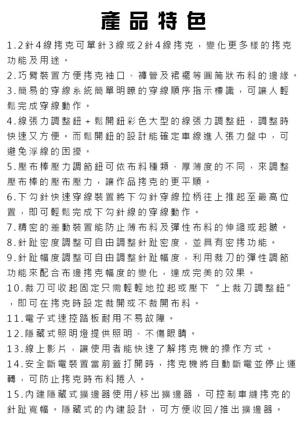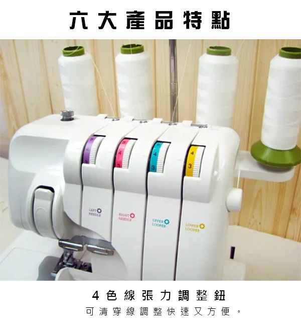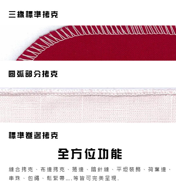 布料收邊/密拷 全方位專業功能機、3-4線2針專用拷克機、自由調整張力系統、清楚的穿線標示。