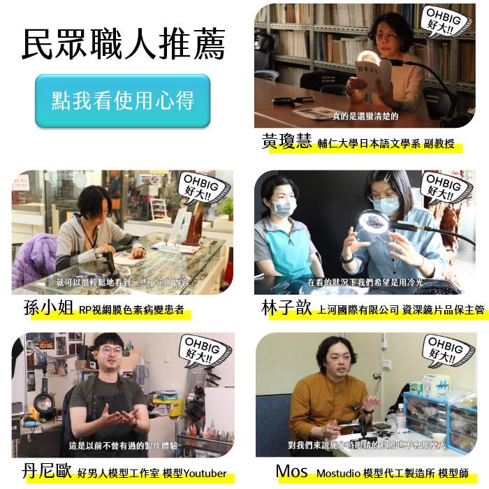 「OHBIG」產品系列,以視覺障礙者的角度並結合視光領域專業,期望未來持續研發各種改善視覺困擾的輔具。以放大鏡探索知識書海、望遠鏡探索生態奇景、顯微鏡探索微觀奧秘!挑選最適合自己的視覺輔具、戶外用品、光學儀器,享受光學帶來的美好生活與提昇工作效率。