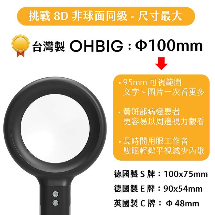 透過中央大學光電工程研究所專業的非球面成像光學設計,【OHBIG】在8D 屈光度時同時具備直徑 100mm 的大尺寸鏡面(95mm 可視範圍),挑戰世界最大尺寸 8D 鏡面,並透過非球面設計大幅減少球面像差,讓黃斑部病變 (中心視野缺損) 患者、破碎視野患者都能夠利用周邊視力進行較舒適地觀看;方便長時間使用者透過雙眼輕鬆觀察,減少眼球內聚,提昇觀看品質。