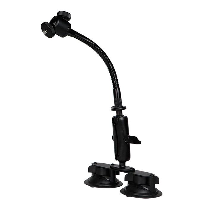 可吸附於塑膠、金屬、玻璃、磁磚等平整表面,包含【20cm 金屬鵝頸管】、【金屬製機身橡膠雙吸盤底座】、【金屬製小型雲台】,皆具備1/4"螺絲孔,可組合搭配、單獨分離使用。