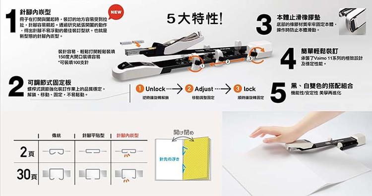 ・150度開口,裝填容易(可裝針數100支),輕鬆裝訂