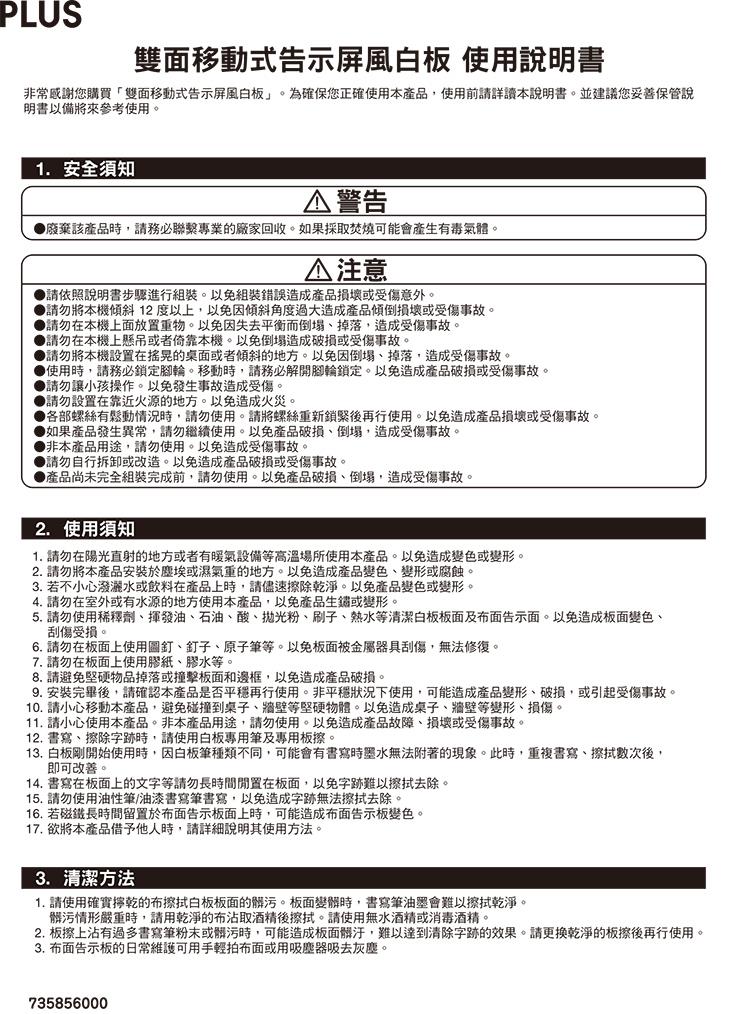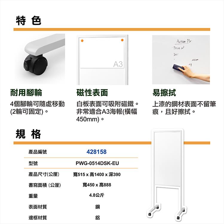 PLUS PWG-0514DSK-EU移動式告示雙面告示屏風白板 450x888mm